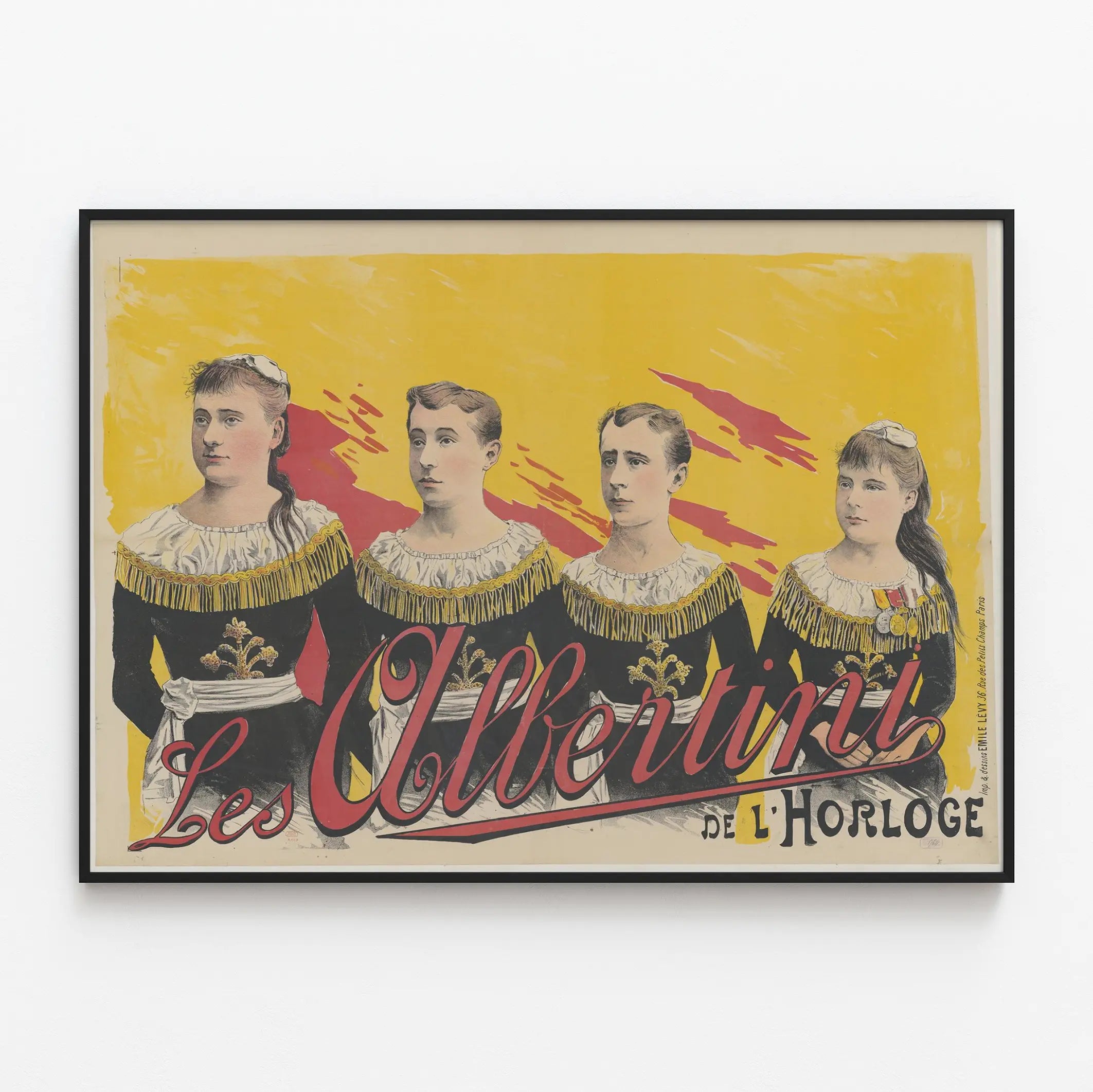 This vintage poster "Les Albertini de l'Horloge" is an essential wall decoration piece for enthusiasts of retro art and historic graphic styles. Printed with a vibrant yellow background, it features four elegantly dressed figures, imagined to be part of an artistic troupe or an old performance. Their black clothing adorned with gold patterns and fringes, along with the medals worn by one of the figures, give a theatrical and distinguished appearance to this poster. The red and black lettering with refined typography adds a touch of dynamism and authenticity, reminiscent of vintage advertising posters from past eras. This poster is perfect for enhancing the interior decor of a living room, office, or cultural space, bringing a retro and elegant atmosphere. Its large size and bright colors make it a striking poster that captures attention and elevates any plain or minimalist wall. Ideal for lovers of original wall decoration, it fits equally well in contemporary settings or more traditional decor, offering a strong vintage visual accent. Whether for a collector or to redecorate a room with an artistic touch, "Les Albertini de l'Horloge" is a refined choice that adds character to your interior. This poster invites you to travel through time and immerse yourself in a period aesthetic, while remaining a modern and stylish decorative element.