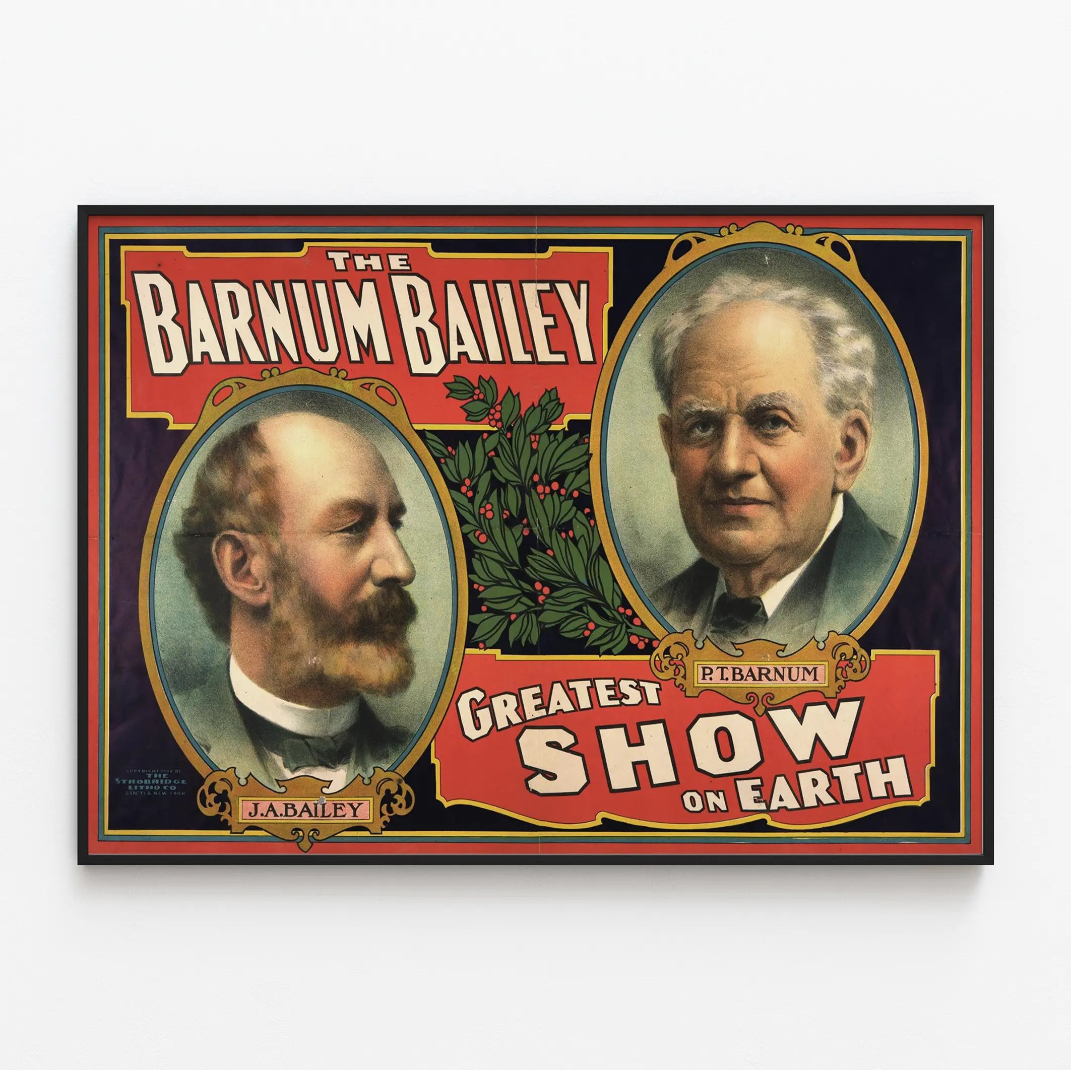 Add a touch of history and vintage charm to your wall decor with this original poster "The Barnum Bailey Greatest Show on Earth." This retro-style print features two detailed portraits framed in gold, depicting P.T. Barnum and J.A. Bailey, renowned figures in the circus world. The bright red and navy blue background enhances the visual impact of this wall decoration, while green foliage and white letters emphasize the unique character of this typographic and illustrative artwork. Ideal for a living room, office, or themed space, this poster evokes the spectacular and festive universe of traditional circuses while offering an elegant and decorative aesthetic. This print stands out with its meticulous design, contrasting colors, and nostalgic atmosphere, perfect for vintage wall decor enthusiasts and collectors of historical posters. A remarkable addition to a retro-style interior, this artwork can also be framed to enhance its presence and protect the piece. Give your walls a spectacular and timeless ambiance with this high-quality illustration, capturing the essence of the tent show and extraordinary performances.