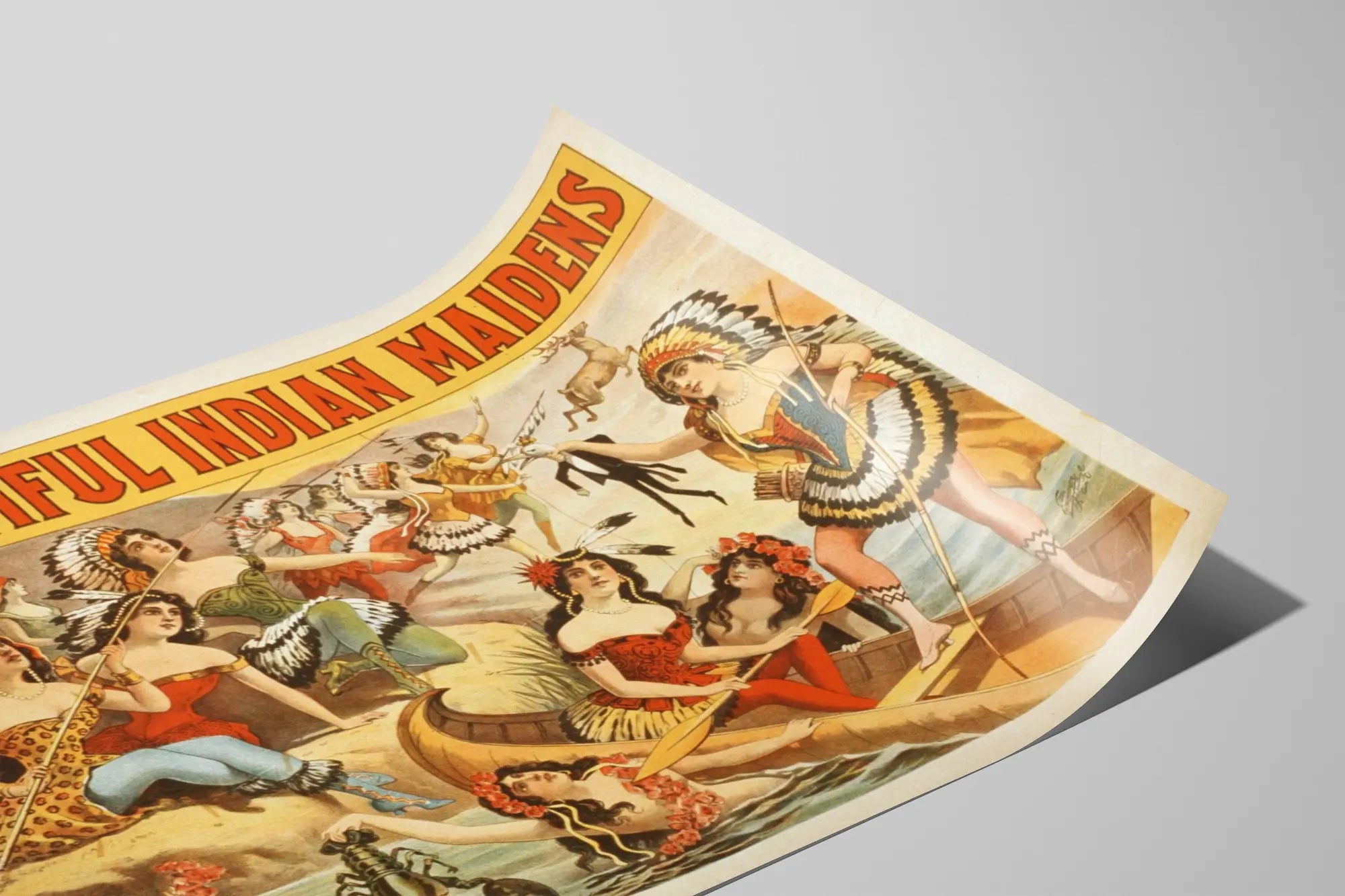 Discover this vintage poster titled "The Beautiful Indian Maidens," a captivating retro wall decoration. This colorful print depicts a multitude of young women dressed in costumes inspired by classic Native American attire, adorned with feathers and traditional accessories, in a rich and dynamic composition. The illustration features a group of these young women in various poses and activities, some paddling in a boat, others on the shore or in the water, all united in an imaginary universe blending nature and folklore. This wall art is perfect for adding a touch of originality and history to your interior, playing on nostalgia and the aesthetic of vintage advertising posters. With its warm colors and detailed craftsmanship, this wall decoration fits seamlessly into a living room, office, or recreational space, creating a vintage and artistic atmosphere. This poster is a decorative piece that will delight enthusiasts of old graphic art, ethnic motifs, and scenic naturalist scenes.