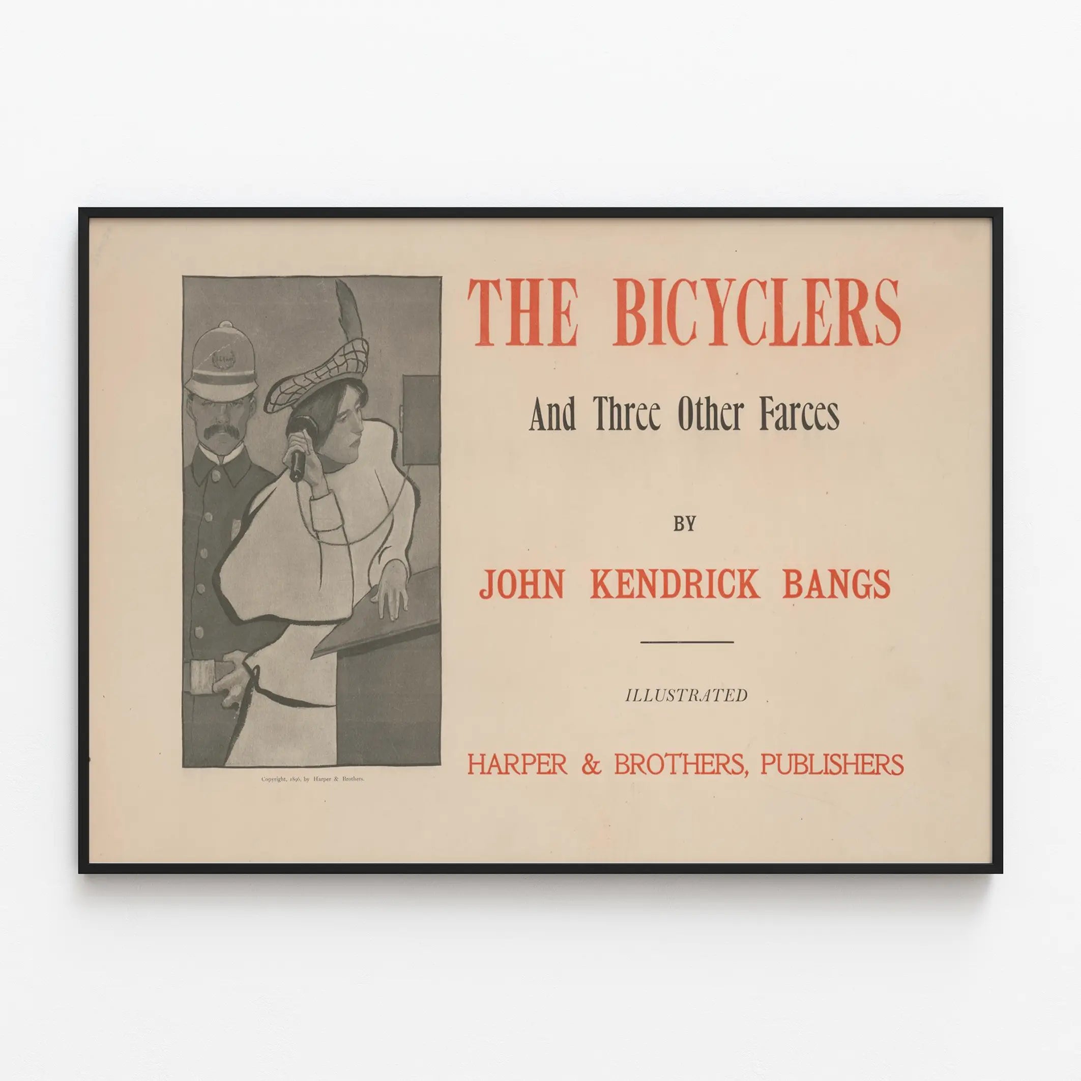 Discover this vintage poster titled "The Bicyclers And Three Other Farces" signed by John Kendrick Bangs. This unique wall decoration features an iconic retro design from the late 19th century, with a graphic visual where a female silhouette, wearing a feathered hat and holding an antique telephone, stands out against a police officer. This poster evokes a classic universe where the art of performance and comedy come to life, perfect for adding a touch of authenticity and history to your interior. Thanks to a typographic choice in red and black, this poster stands out with its simple elegance and a style that is both understated and striking. Ideal for enthusiasts of graphic art and vintage wall decor, this piece can embellish the walls of living rooms, offices, or cultural spaces. Choosing this poster means opting for a wall decoration that tells a story and invites exploration of a rich artistic and literary era. A wall ornament that combines vintage charm and originality, perfect for personalizing a space with a warm and nostalgic atmosphere.