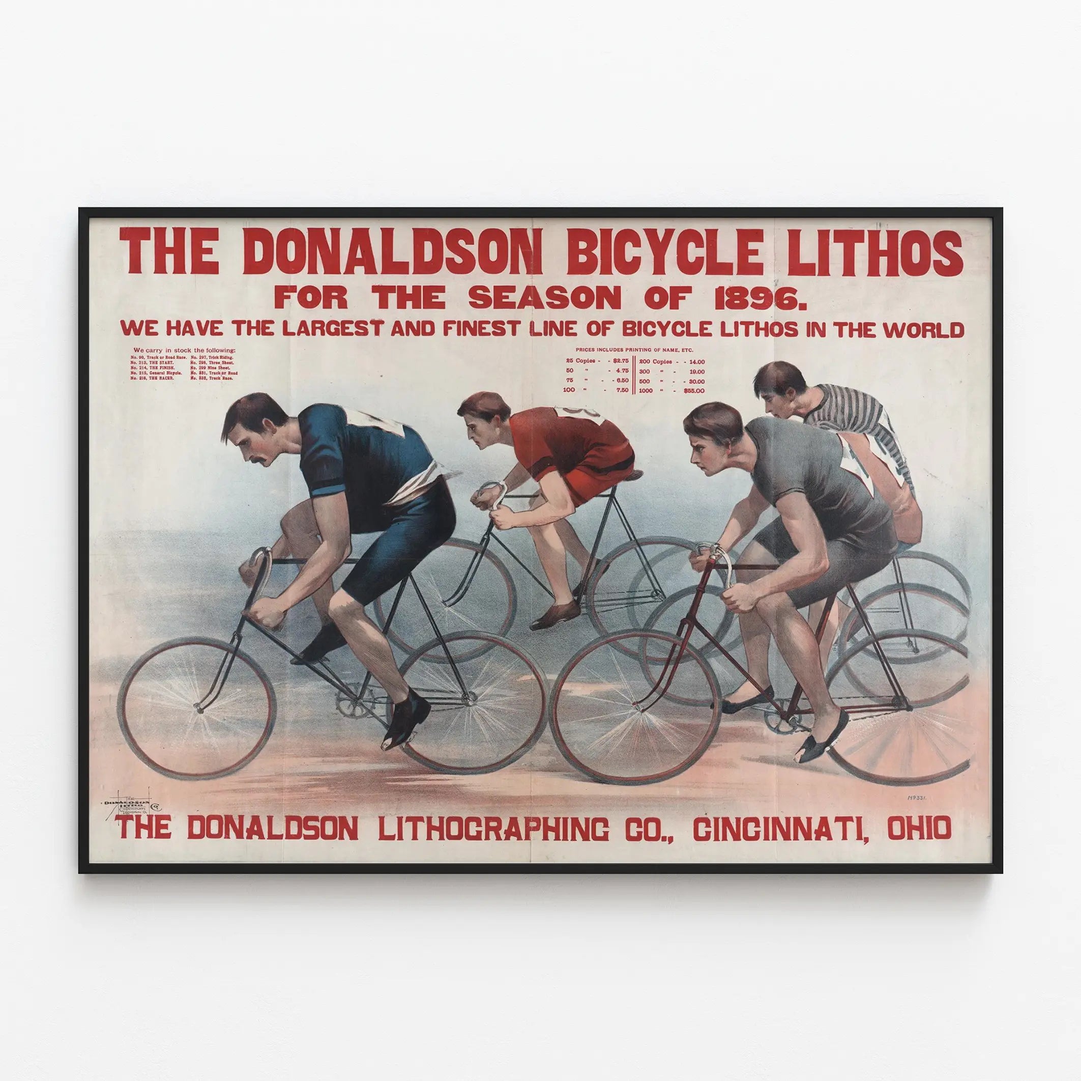 Discover this vintage poster titled "The Donaldson Bicycle Lithos For The Season of 1896," a true collectible piece for enthusiasts of retro-style wall decor. This original advertising print originates from the Donaldson Lithographing Company, based in Cincinnati, Ohio. It depicts four cyclists racing on period-appropriate bicycles, embodying the energy and passion of cycling at the end of the nineteenth century.