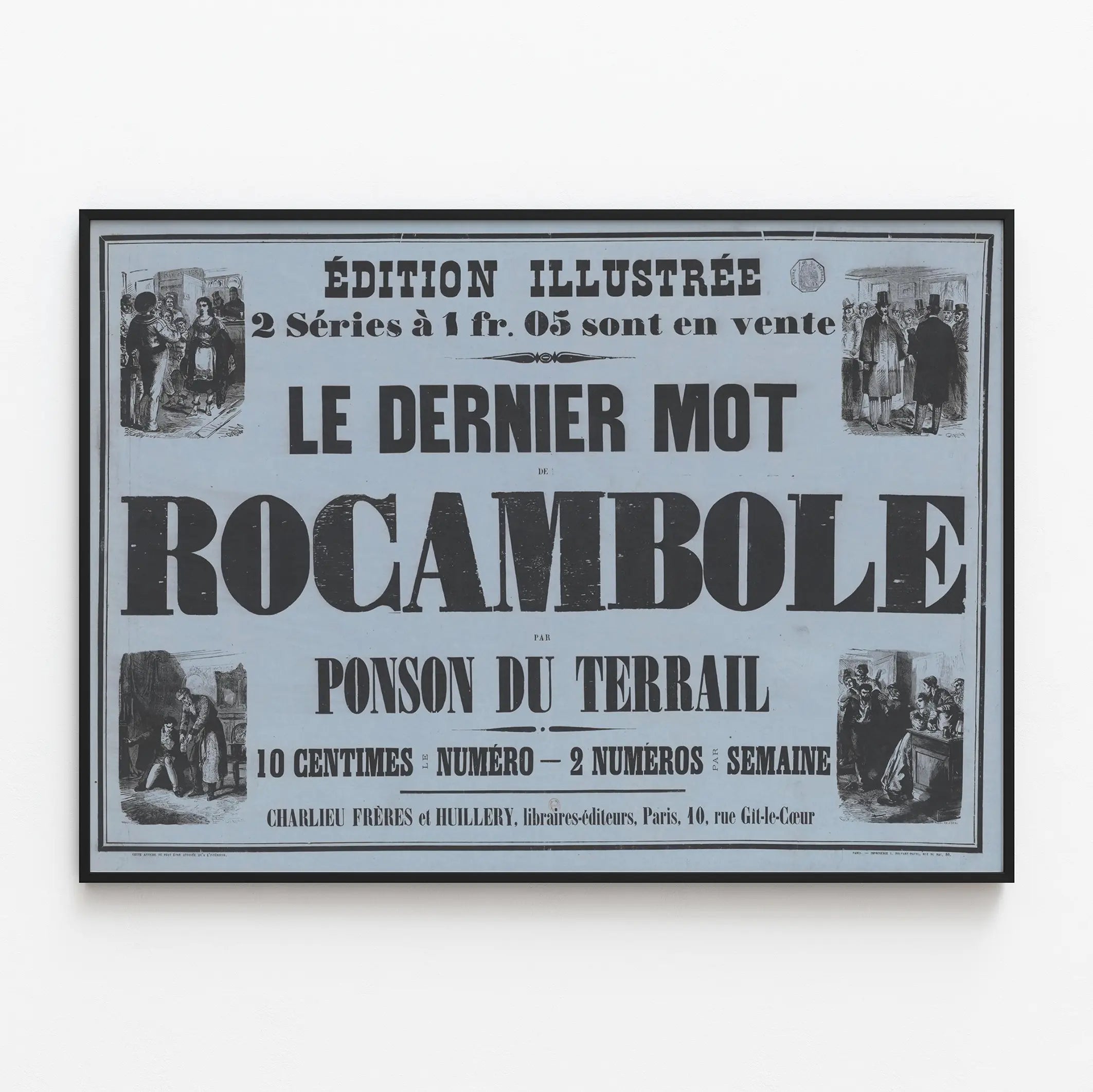 This vintage art print "Le Dernier Mot de Rocambole" by Ponson du Terrail adds a touch of literary history and nostalgic charm to your wall decor. Printed in black on a light blue background, this art print is a reproduction of an old illustrated edition, featuring bold and classic typography that captures the eye. The elegant layout is complemented by four engraved-style illustrations located at the corners of the print, adding a narrative and visual dimension that enhances its decorative appeal.