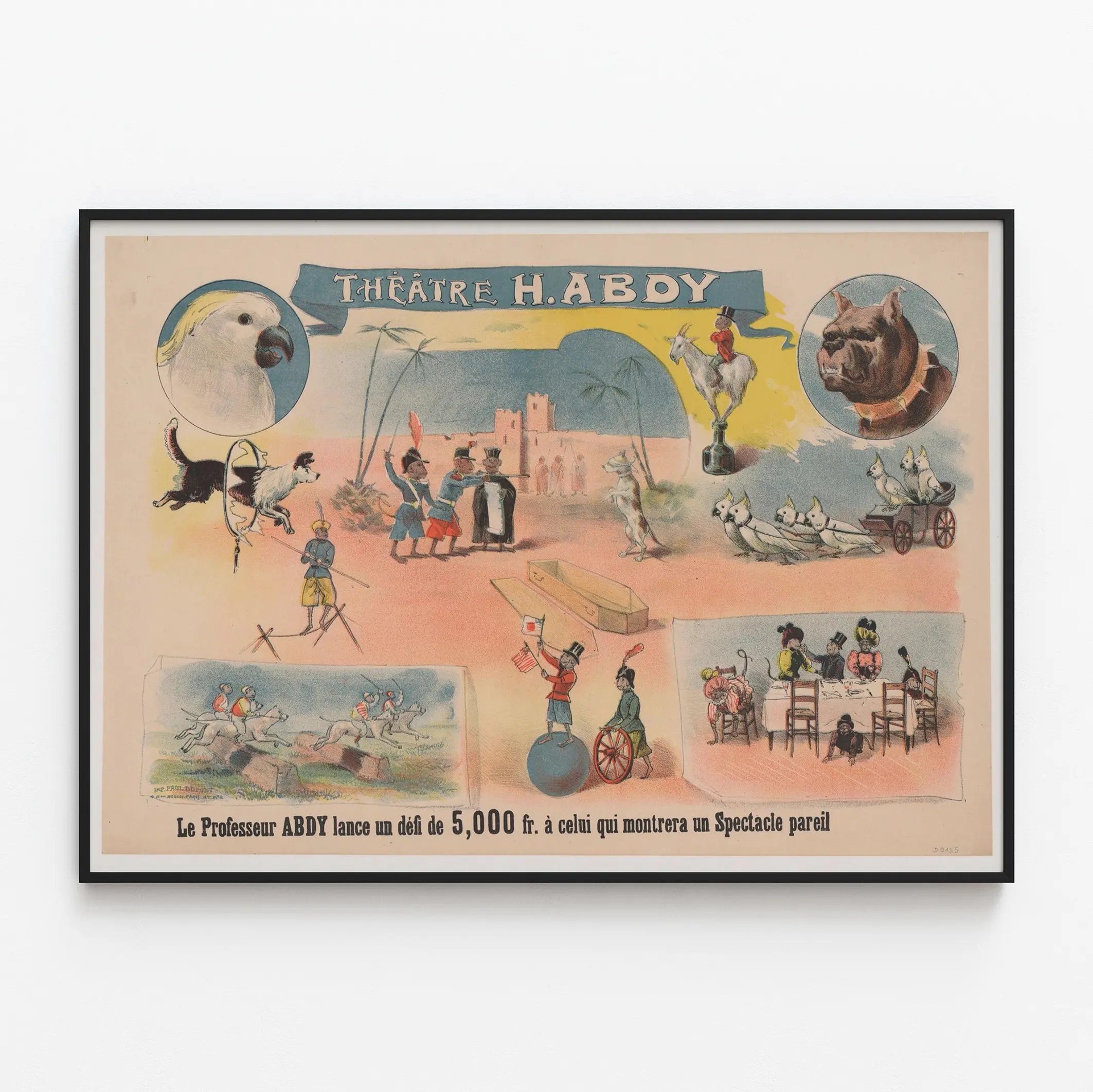 This vintage poster is an iconic piece from the H. Abdy Theatre, illustrating the challenge issued by Professor Abdy: 5,000 francs to anyone who could present an identical show. This antique-style poster captures with finesse and humor a performance combining trained animals and spectacular act numbers. It features various elements of the theatrical scene such as a parrot, a dog jumping through a hoop, actors in period costumes, a goat mounted by a small figurine in a bowler hat, and several cockatoos engaged in a playful staging. The colorful and delicate atmosphere of this wall decoration is perfect for enthusiasts of retro art and the history of entertainment. Artistic poster or print, it will add an original and authentic touch to your wall decor. Ideal for a living room, an office, or a performance hall, this image invites you on a journey through time and into the fascinating world of animal shows and theatrical performances of the past. The balanced composition highlights the liveliness of the characters and animals in a simple yet evocative setting. This printed artwork offers a fine example of theatrical lithography used to announce and celebrate unique performances, while elegantly decorating your walls with an ambiance full of history and creativity.