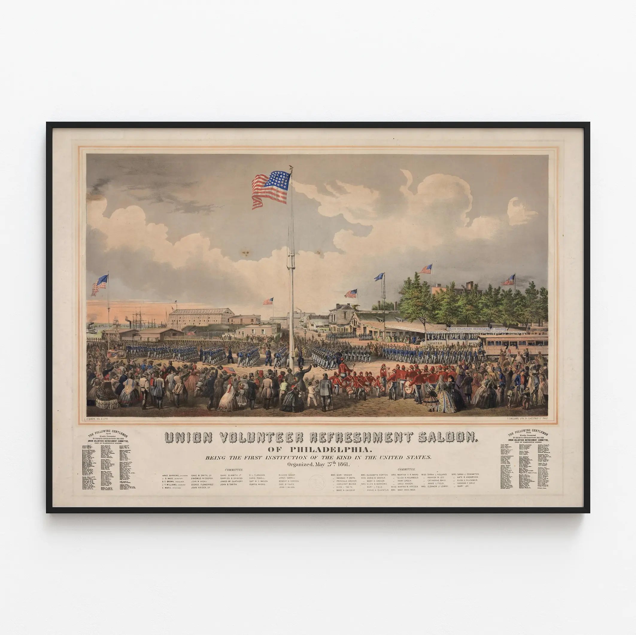 This vintage poster depicts a historic scene held in Philadelphia, representing the Union Volunteer Refreshment Saloon, a landmark venue that welcomed and supported Union volunteers during a significant period in United States history. This print makes a unique wall decoration piece, reflecting the atmosphere of public and military events, with a large crowd composed of uniformed soldiers and diverse civilians observing the scene. The floating American flags add a patriotic touch to this illustration, which offers a rich perspective of a lively square with its buildings and field furniture. This lithograph print is also adorned with lists of names, likely those of organizers or contributors associated with this institution, adding a valuable layer of historical detail. As a poster, it is ideal for enthusiasts of American history and lovers of vintage wall decor, seeking to incorporate a meaningful and authentic decorative element into their interior. This wall ornament can find its place in a living room, office, or library, bringing a touch of historical elegance and period atmosphere. Its colorful and precise rendering makes it an attractive poster that combines aesthetic appeal with collective memory, perfect for enriching a space with its visual story and retro charm.