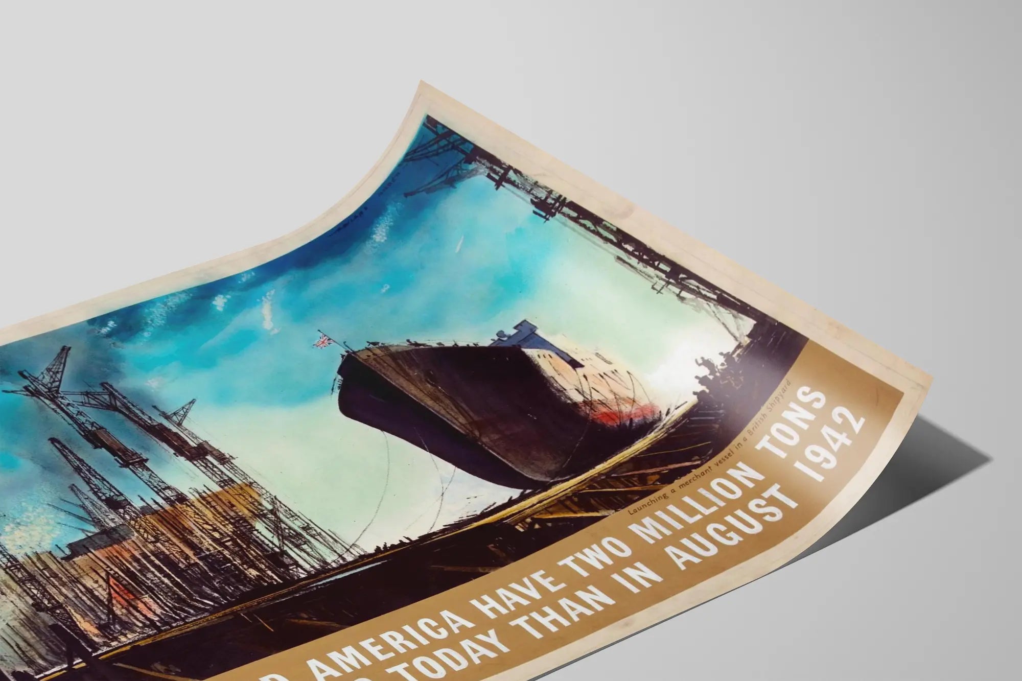 This vintage poster depicts the maritime strength of Great Britain and America, highlighting a significant increase in shipping capacity, with two million additional tons compared to August 1942. Representing a merchant ship launched at a British shipyard, this wall decoration captures the industrial atmosphere and the dynamic of naval production during a pivotal period. With its vivid colors and striking graphic style, this poster is a unique piece ideal for enthusiasts of history, maritime themes, and retro design. It will fit perfectly as a painting or poster in an interior seeking a historical and authentic touch. Whether in a living room, office, or library, it will bring a maritime ambiance and a powerful visual narrative around the theme of transport and industrial effort. This artwork promotes an original wall decoration, combining mid-20th-century artistic style with a strong historical message, symbolizing the rise of logistical capacities during World War II. This poster is also an excellent idea to personalize a space dedicated to maritime passion or vintage industrial decor.