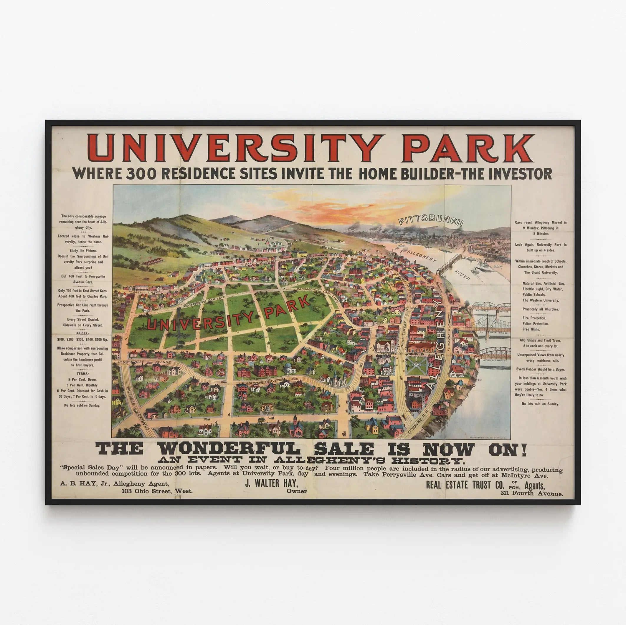 Discover this vintage poster depicting the University Park neighborhood, a detailed map highlighting 300 residential sites near Allegheny, with a panoramic view of Pittsburgh and its surroundings. This wall art piece is an original decorative print, ideal for enthusiasts of historical cartography and retro-style interior decor. On this illustrated chart, you can see the layout of streets, houses, and green spaces organized around Western University, emphasizing an attractive real estate project for investors and home builders. Infrastructure such as bridges, railways, and tram lines are also detailed, offering an immersive glimpse into the urban planning of the era. This wall decoration poster is perfect for adding an authentic and historical touch to a wall, whether in a living room, office, or bedroom. It highlights the valorization of residential areas and local amenities such as schools, churches, markets, and various public services, reflecting a balance between urban development and community life. Enrich your interior with this artistic and informative map, evoking both urban history and a large-scale real estate project. This wall artwork stands out with its graphic design and explanatory text, offering a unique and captivating overview of the University Park real estate development in Allegheny.