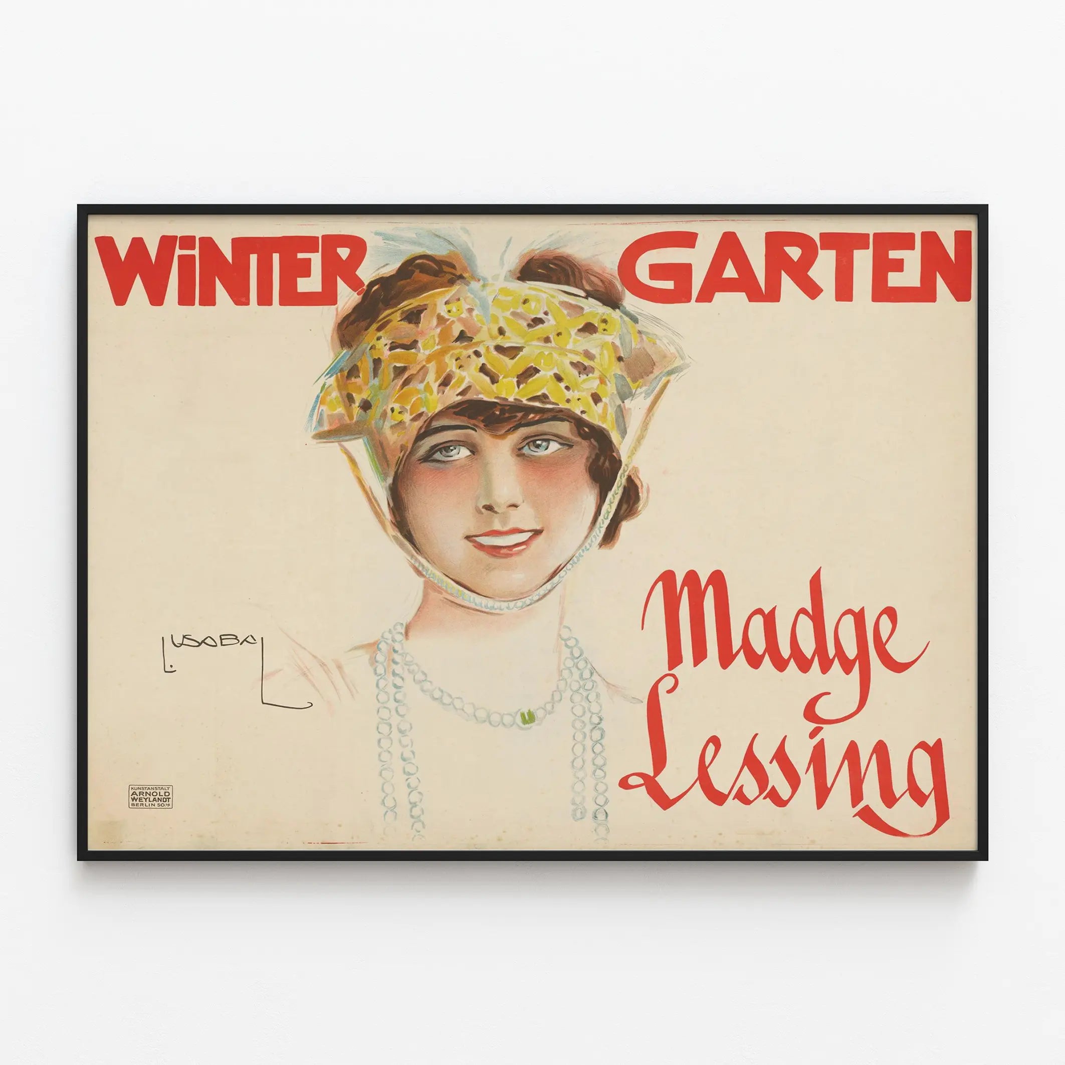 This vintage poster "Wintergarten Madge Lessing" is a wall decoration element that adds a touch of retro elegance to any interior. The poster features a delicately illustrated portrait of a woman wearing a hat decorated with yellow patterns, with a string of white pearls, her smile and light eyes instantly capturing attention. The design is distinguished by soft colors and precise lines, typical of early advertising art. The bright red text "WINTER GARTEN" at the top of the poster draws attention to the scene, while the name "Madge Lessing" is written in stylized letters on the right side, providing perfect visual balance within the composition. This poster is printed on a light beige background, creating a harmonious contrast with the graphic elements and enhancing its vintage appearance. As wall decor, a poster like this is ideal for enthusiasts of retro art and early 20th-century graphic design. Whether for a living room, an office, or a cultural space, this vintage poster brings a soft and sophisticated atmosphere, evoking the elegance of a bygone era. This type of wall decoration is perfect for creating a gallery wall or embellishing a single wall. Its size and design allow it to easily fit into various interior styles, from classic to contemporary, highlighting the beauty of the illustration and the charm of the vintage style. Choosing this vintage poster "Wintergarten Madge Lessing" means opting for an authentic decorative piece that contributes to the aesthetic of a room by adding an artistic character and a rich visual story. Ideal for lovers of wall decoration, this printed artwork also makes a unique gift for enthusiasts of vintage art and culture.