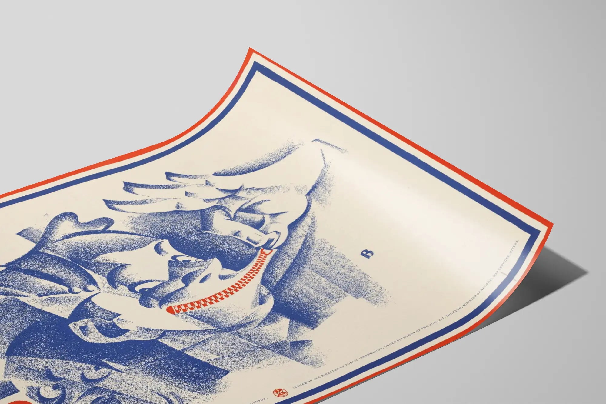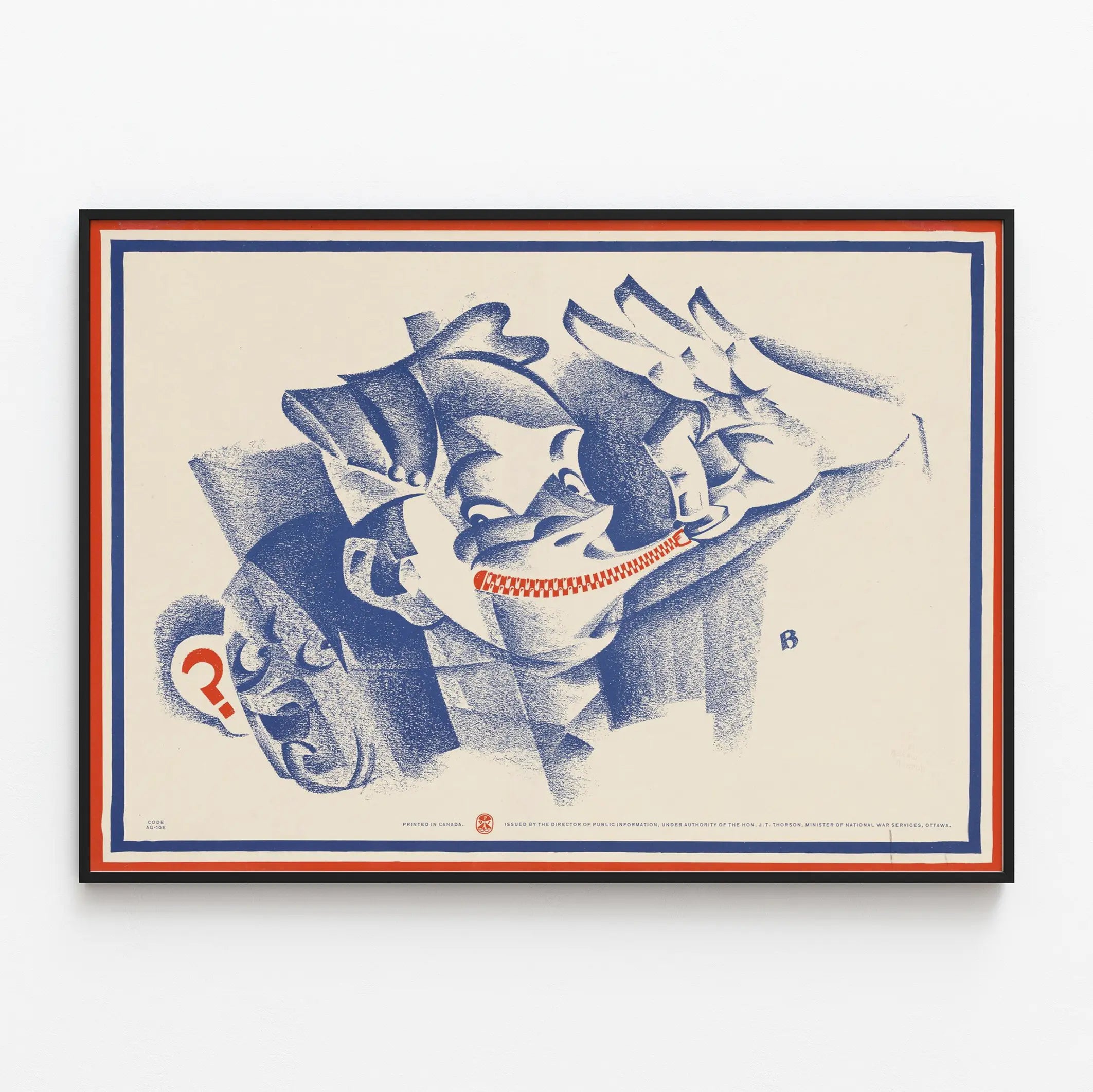 This vintage poster with a unique graphic style features a character with expressive traits, drawn with blue dots, with a mouth replaced by a red zipper, a powerful symbol of silence or secrecy. The outline of the artwork is framed by a double border in red and blue, emphasizing the retro aspect and the balanced composition of this wall decoration. The limited palette of blue, red, and white offers a subtle yet striking visual effect, ideal for enthusiasts of wall decor with a retro style or distinctive graphic inspiration. The central character, whose expression is accentuated by geometric features and a raised hand, invites reflection on unspoken words, self-censorship, or controlled communication—themes that can enrich the atmosphere of a room. This poster is perfectly suited for integration into a modern or vintage space, adding a touch of character and depth while remaining a stylized decorative object easily combined with other wall elements. The balance of primary colors and the cubist shape of the features give this poster an undeniable charm that will captivate the eye and arouse curiosity. Perfect for a living room, a creative office, or a gallery, this aesthetic print appeals to those seeking to decorate their walls with strong graphic works that carry meaning while ensuring an original and elegant visual coherence.