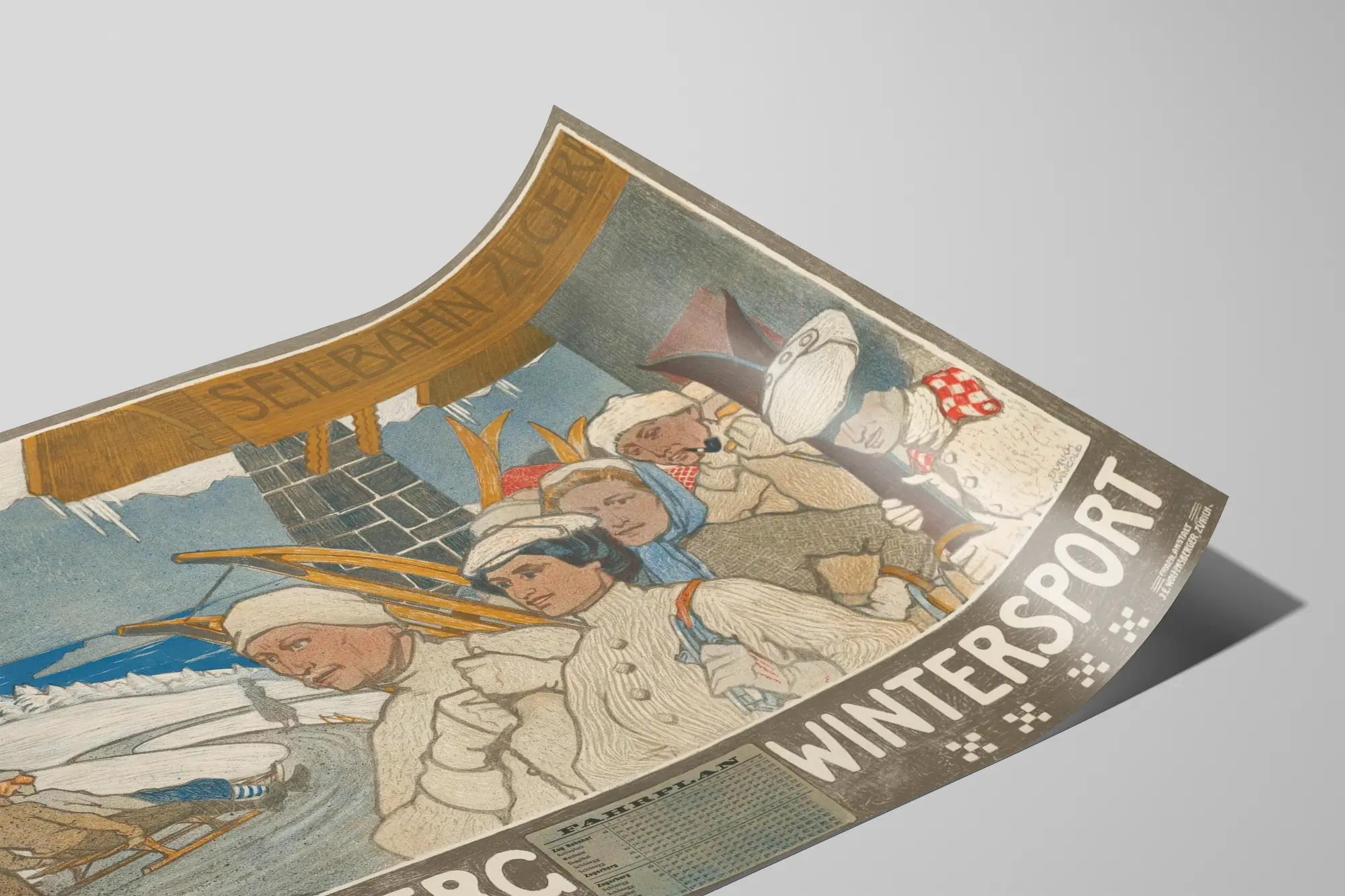 This wall decoration combines nostalgic charm with a wintery atmosphere, perfect for enthusiasts of skiing and alpine nature. The illustration highlights period equipment, such as wooden skis carried on the shoulder and woolen hats, enhancing the authentic and warm character of this wall art. A transportation timetable poster is also visible, emphasizing the historical importance of Zugerberg as a location accessible by cable car, facilitating mountain travel.