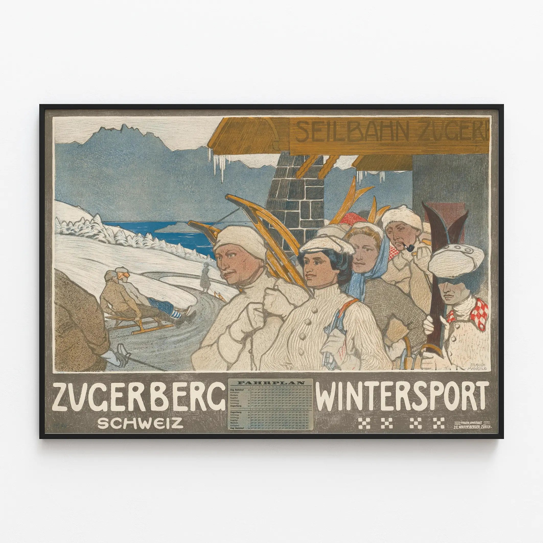 Discover this exceptional vintage poster dedicated to Zugerberg, an iconic destination for winter sports in Switzerland. This print depicts a group of skiers and winter sports enthusiasts dressed in traditional clothing, ready to enjoy the snowy slopes under a clear sky. It also features a sledge on a winding path descending among snow-covered fir trees, with a body of water and a majestic mountain range in the background, offering a typical Swiss Alpine landscape.