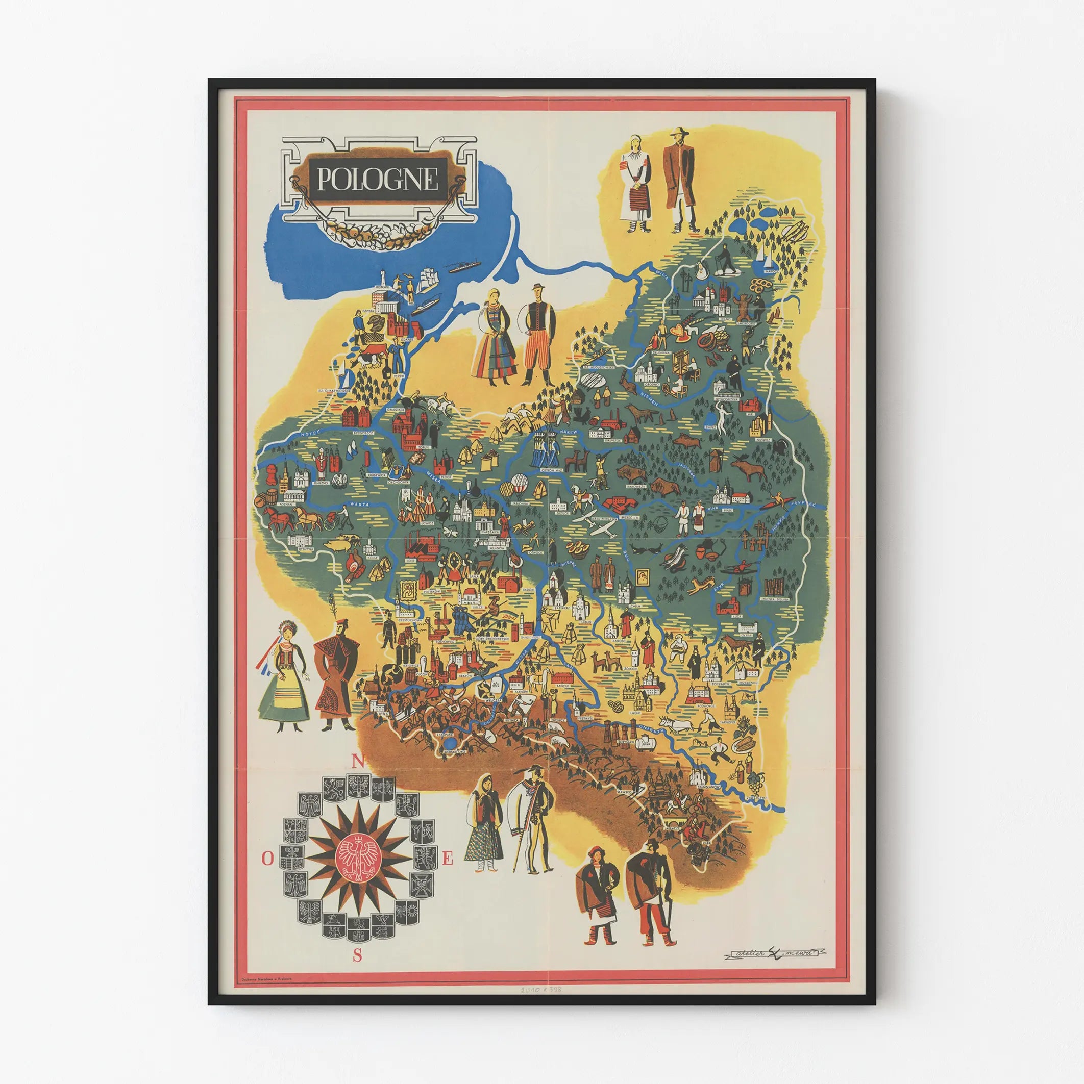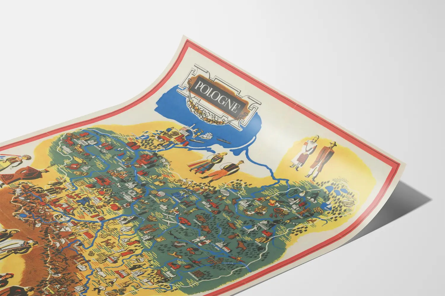 This wall decoration poster is an artistic and traditional representation of Poland, designed as a colorful illustrated map. This vintage poster offers a detailed and symbolic view of the country with graphic elements that evoke both geography, cultural heritage, and local activities. The map is divided into distinct colored zones, outlining different regions, while rivers and major cities are highlighted with iconic illustrations. Characters in traditional costumes, agricultural and craft scenes, as well as regional symbols are arranged on the map, illustrating Poland's cultural and historical diversity. This wall artwork is ideal for enthusiasts of decoration who wish to add a touch of authenticity and folkloric charm to their interior. It can be used as a decorative poster in a living room, office, or reception area, to spark curiosity about Polish traditions or simply as a colorful and original element of wall decor. The retro graphic style and the balanced use of colors – blue, yellow, brown, red – enhance its decorative aspect while highlighting the intricate details of this illustrated map. In summary, this wall panel is an invitation to travel and cultural discovery through an aesthetic wall piece that will delight fans of antique cartography and regional history.