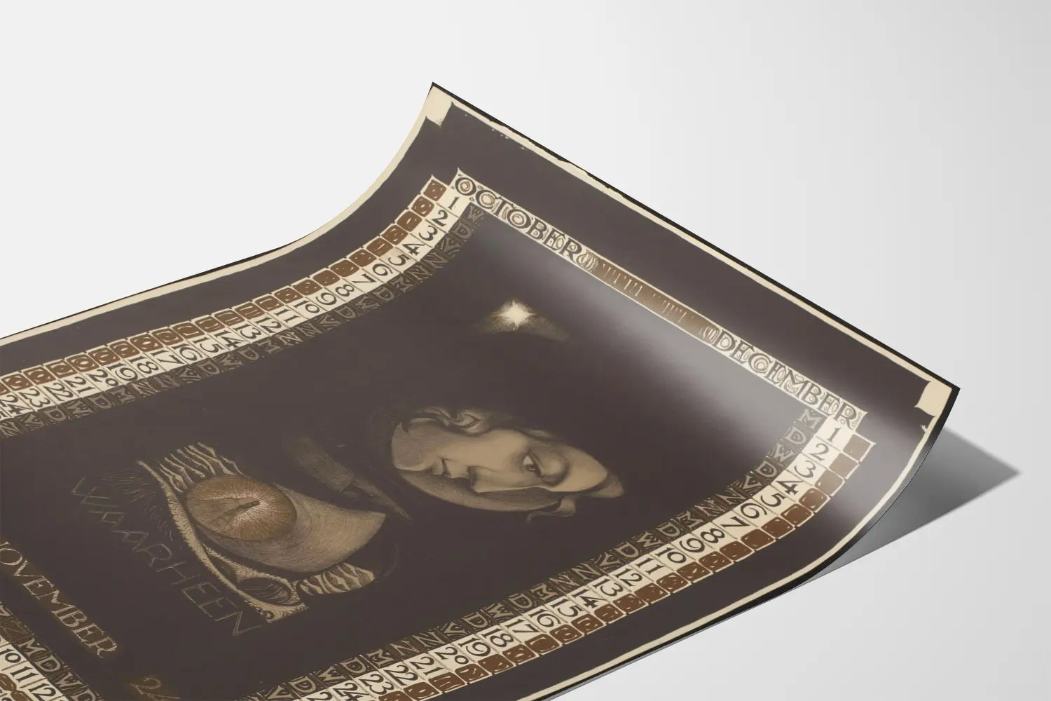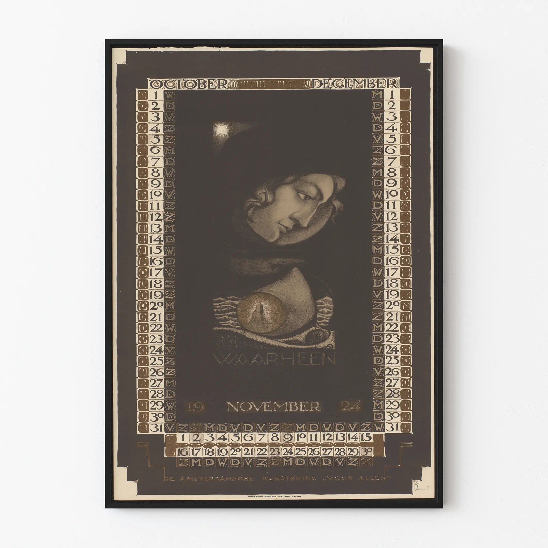 Discover this vintage calendar poster covering the months of October, November, and December 1924, a unique piece for your wall decoration. This antique poster features an artistic style characterized by a limited palette of browns, blacks, and beiges, creating a warm and nostalgic atmosphere. The calendar is framed by a delicate graphic pattern with the days of the week in typographic abbreviations and the dates scrolling vertically along the sides and at the bottom. At the center, the face of a character in profile with delicate features stands out in a finely shaded illustrative style, perhaps symbolizing reflection or wisdom, with a graphically rich depiction incorporating a luminous circular element on a marine background and the phrase "Waarheen," suggesting a question or a path to follow. At the bottom, the inscription "De Amsterdamsche Kunstkring voor Allen" evokes a connection with an artistic association from Amsterdam. This wall decoration adds a retro and artistic touch, perfect for an interior that values the charm of vintage objects and the beauty of old graphic prints. The poster is ideal for completing a wall of prints, adding character to a library or office, or integrating into a cultural or artistic space. Thanks to its clean style and careful composition, this antique calendar poster perfectly suits vintage, bohemian, or even modern decor seeking an elegant contrast. Adopt this piece as a decorative element that tells a story, while offering an original functional touch with its period calendar, remarkable for enthusiasts of design history and graphic arts.