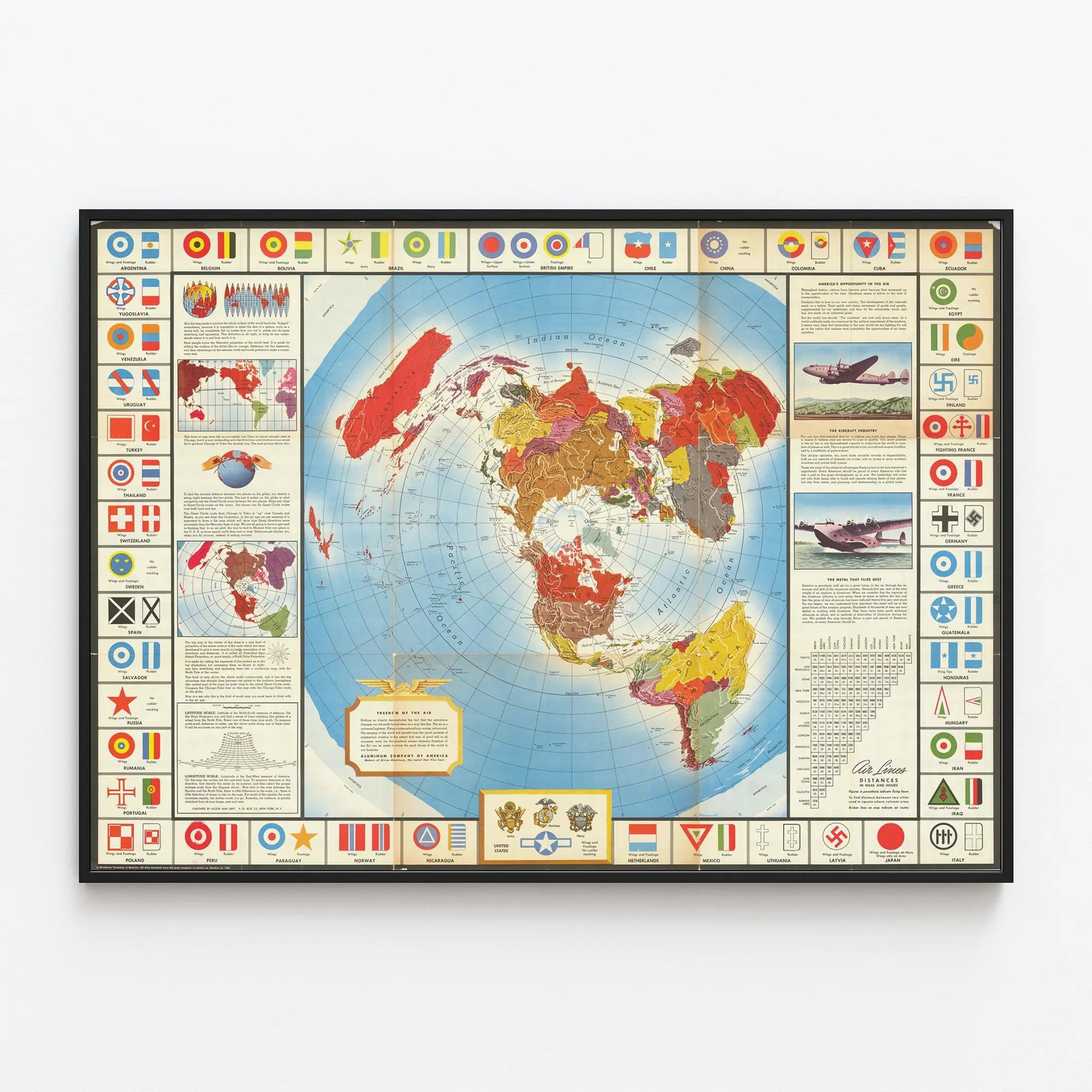 This wall poster depicts a detailed historical map of the world during the Second World War, offering a unique perspective on the geopolitics and aviation of that era. This wall decoration is ideal for enthusiasts of history, geography, and vintage art, seeking a poster that is both aesthetic and informative.