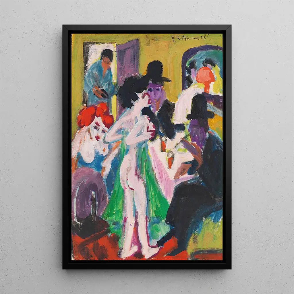 Au bordel : een duik in de intimiteit van menselijke passies In dit indrukwekkende kunstdruk neemt Ernst Ludwig Kirchner ons mee naar het hart van een bordel, een ontmoetingsplek waar emoties samensmelten met sensualiteit. De dynamische compositie, gekenmerkt door gedurfde lijnen en levendige kleuren, creëert een sfeer die zowel verontrustend als fascinerend is. De menselijke figuren, vaak vervormd, lijken te dansen in een spel van licht en schaduw, waarbij de spanningen en verlangens worden onthuld die deze besloten ruimte beheersen. Kirchner, met zijn expressieve techniek, slaagt erin de essentie van het stadsleven aan het begin van de 20e eeuw vast te leggen, en biedt een rauwe en poëtische visie op de menselijke conditie. Ernst Ludwig Kirchner : pionier van het Duitse expressionisme Geboren in 1880, is Ernst Ludwig Kirchner een van de grondleggers van de expressionistische beweging in Duitsland. Geïnspireerd door het fauvisme en primitieve kunst, ontwikkelt hij een unieke stijl, gekenmerkt door heldere kleuren en vervormde vormen. Kirchner vestigt zich in Berlijn, waar hij diep wordt beïnvloed door de bruisende stadsleven en de sociale onrust van zijn tijd. Zijn werk, vaak autobiografisch, weerspiegelt zijn innerlijke strijd en zijn engagement met de moderniteit. Naast zijn artistieke carrière is Kirchner ook een getuige van de politieke en sociale spanningen die de tragedies van de 20e eeuw voorafschaduwen, wat zijn werk een onmisbare historische betekenis geeft. Een decoratief kunstdruk met vele troeven De kunstdruk van het schilderij Au bordel is een gedurfde decoratieve keuze die uw interieur zal verrijken, of het nu in een woonkamer, kantoor of slaapkamer is. De kwaliteit van de afdruk en de trouw aan de originele kleuren garanderen een onmiskenbare esthetische aantrekkingskracht. Door deze doek in uw decoratie te integreren, brengt u een vleugje expressionisme en moderniteit in huis, terwijl u gesprekken over kunst en stadsleven stimuleert. Dit werk, zowel provocerend als emotioneel, zal een unieke sfeer aan uw ruimte toevoegen, waardoor elk bliksem een moment van contemplatie en ontsnapping wordt.
