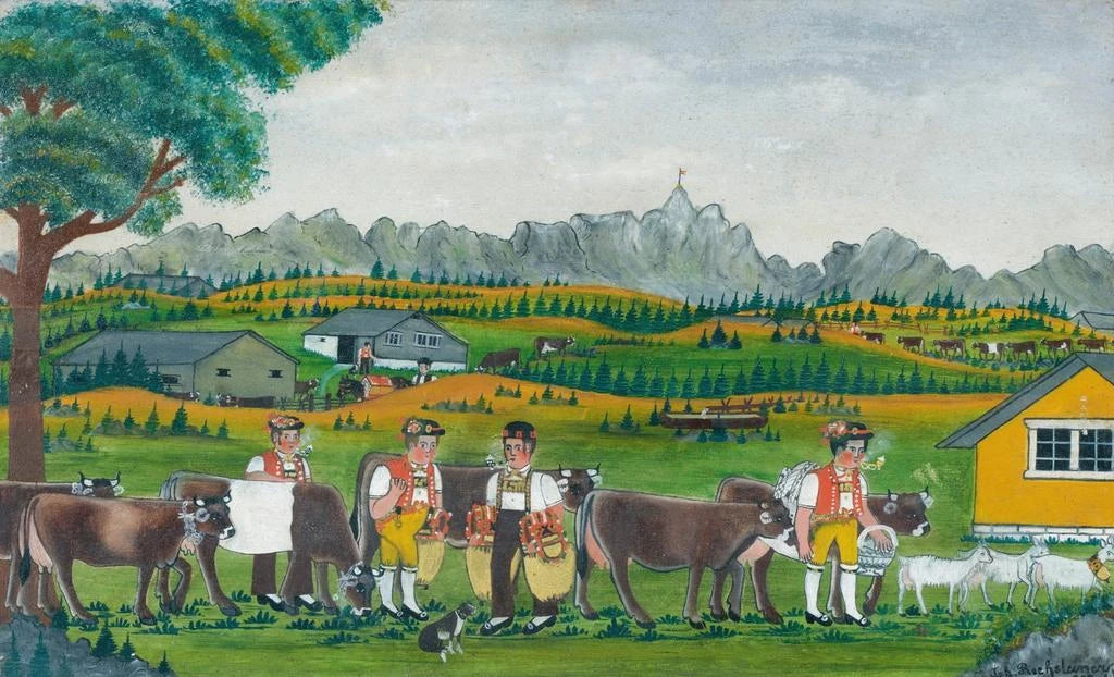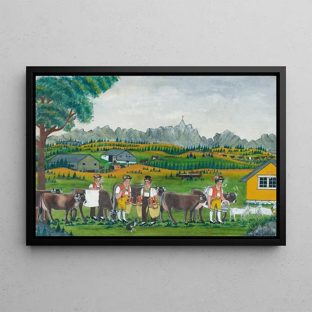 "Arrivée à l'alpage", œuvre de Johannes Rechsteiner, évoque la beauté majestueuse des paysages alpins. Ce tableau capture un moment de sérénité où les personnages, entourés de montagnes imposantes, semblent en harmonie avec la nature. Les teintes douces de vert et de bleu, associées à des touches de lumière dorée, créent une atmosphère paisible et contemplative. La technique de Rechsteiner, marquée par une attention minutieuse aux détails, permet de ressentir la fraîcheur de l'air alpin et la tranquillité du cadre, invitant le spectateur à s'évader dans cet environnement idyllique.