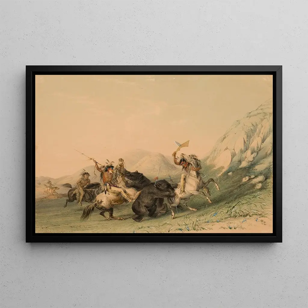 In deze kunstdruk van het werk "Aanval van de grizzlybeer" dompelt George Catlin ons onder in een dramatisch en indrukwekkend tafereel. De kunstenaar vangt met verve de intensiteit van de confrontatie tussen mens en natuur, met felle kleuren en krachtige contrasten om de dynamiek van de scène te benadrukken. De minutieuze details van de personages en de beer, evenals Catlins techniek die realisme en romantiek combineert, creëren een sfeer die zowel boeiend als verontrustend is. Dit doek roept de strijd om overleving op, terwijl het tegelijkertijd de majesteit van de wilde fauna viert.