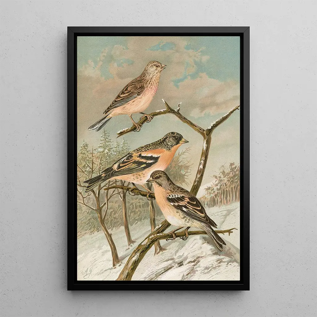 De kunstdruk van Acanthis cannabina Fringilla montifringilla door Johann Friedrich Naumann is een ware eerbetoon aan de diversiteit van vogelsoorten. Dit schilderij, rijk aan details, benadrukt de unieke kenmerken van het vogel, met genuanceerde tinten die de zachtheid van zijn verenkleed oproepen. De zorgvuldig samengestelde compositie laat de lichtheid en elegantie van de vogel in volle vlucht voelen. De aquareltechniek, beheerst door Naumann, geeft het werk een sfeer die zowel levendig als rustgevend is. Elk element van het doek lijkt een vluchtig moment vast te leggen, waardoor de kijker wordt uitgenodigd om de vergankelijke schoonheid van de natuur te waarderen.