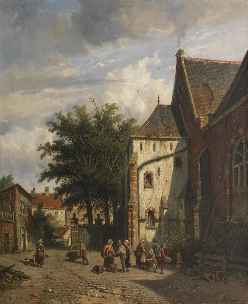 Adrianus Eversen, een iconische figuur binnen de realistische stroming, heeft zijn stijl weten te vestigen binnen het Nederlandse artistieke landschap van de 19e eeuw. Opgeleid bij de grootste meesters van zijn tijd, ontwikkelde hij een unieke aanpak die nauwkeurige observatie combineert met persoonlijke interpretatie. Zijn werk getuigt van een fascinatie voor scènes uit het dagelijks leven, vaak doordrenkt met nostalgie en eenvoud. Eversen heeft vele hedendaagse kunstenaars beïnvloed, die in hem een pionier van het realistische landschap zagen. Zijn vermogen om de essentie van een plek vast te leggen en diepe emoties op te roepen via zijn werken blijft toekomstige generaties inspireren. "Achter de westelijke kerk van Enkhuizen" is zonder twijfel een van zijn meest voltooide werken, dat zijn talent en artistieke visie illustreert.