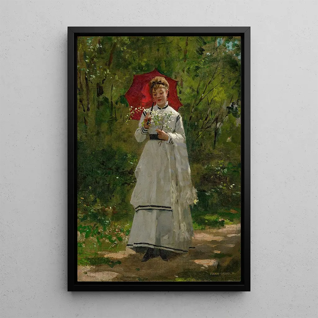 De kunstdruk "Adèle L'Ombrelle" brengt ons naar een moment van gratie en sereniteit. Marie-François Firmin-Girard schildert een jonge vrouw, zachtaardig gekleed, die zich beschermt tegen de zonnestralen met een elegante parasol. De pastelkleuren en het zachte licht creëren een dromerige sfeer, waarin elk detail, van de stof van de jurk tot de omliggende bloemen, zorgvuldig is weergegeven. Dit werk, doordrenkt van romantiek, roept een tijd op waarin mode en natuur harmonieus versmolten, en biedt een poëtische visie op vrouwelijkheid.