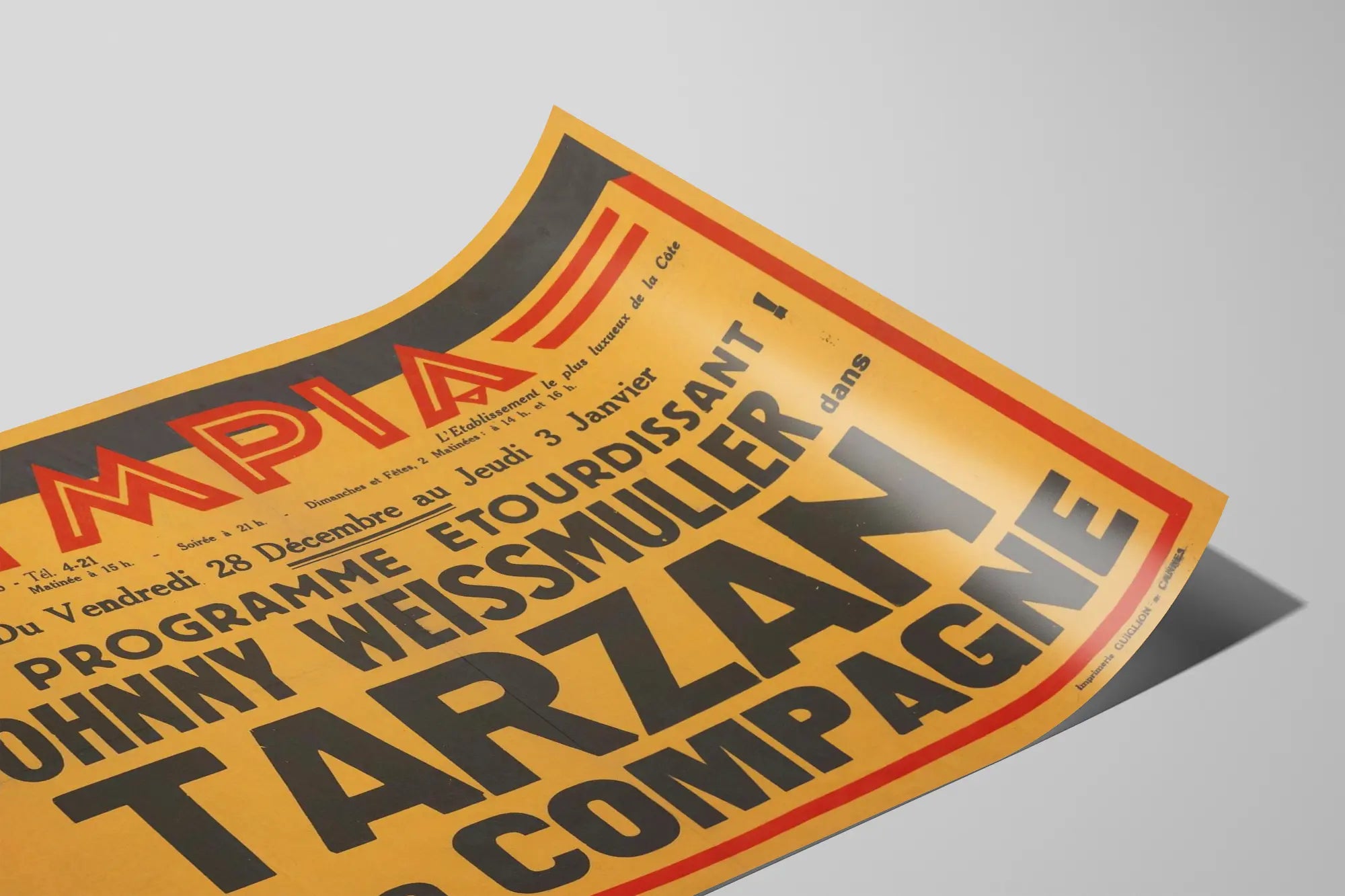 Ontdek deze originele vintage filmposter die de programmering aankondigt van de film "Tarzan en zijn Vrouw" met Johnny Weissmuller in de Olympia, een bioscoop gelegen aan de 67, rue d'Antibes in Cannes. Deze reclameposter, in retrostijl, presenteert een zorgvuldig samengesteld programma van vrijdag 28 december tot en met donderdag 3 januari, en belooft een " duizelingwekkende" filmervaring. De poster gebruikt gedurfde typografie in zwart en rood op een oranjegele achtergrond, wat haar een uniek tijdscharme geeft. Ze verwijst naar een gerenommeerde bioscoop, "de meest luxueuze inrichting aan de Côte" in Cannes, met vertoningen in de ochtend en avond, evenals twee extra vertoningen op zondagen en feestdagen. Deze wanddecoratie is perfect voor liefhebbers van klassieke cinema en vintagefans, en brengt een authentieke en historische toets in elk interieur. Of u nu verzamelaar bent van oude affiches of op zoek bent naar een decoratief poster dat de gouden tijd van het grote scherm oproept, deze affiche van Tarzan, vervaardigd door de Drukkerij Guiglion in Cannes, is een uitstekende keuze. Ze maakt deel uit van de wanddecoratie die door haar eenvoudige maar krachtige grafische ontwerp de sfeer van vroeger cinema oproept. Dit unieke stuk zal een woonkamer, kantoor of speelkamer verfraaien en een krachtig visueel aandenken vormen aan een welvarende periode in de filmgeschiedenis. Durf een wanddecoratie vol geschiedenis aan met deze vintage affiche van de film Tarzan, een ware filmiconografie om trots te exposeren.