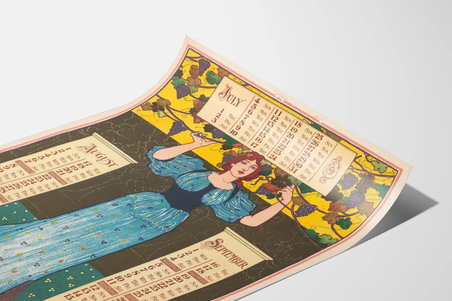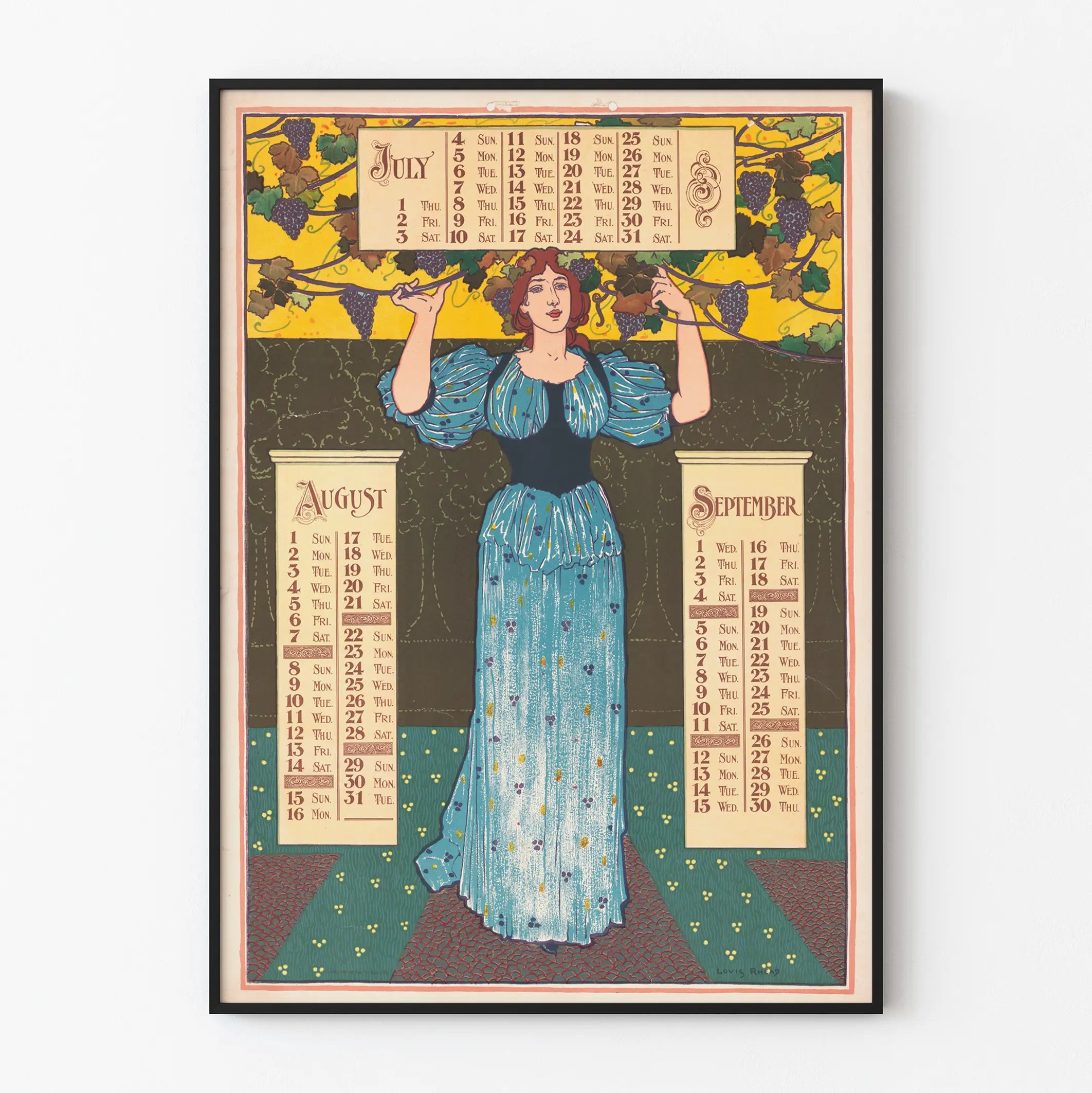 Ontdek dit vintage affiche met een kalender van de maanden juli, augustus en september van het jaar 1897. Deze wanddecoratie combineert zowel de functionaliteit van een kalender als de elegantie van een oud kunstwerk. In het midden staat een vrouwelijke figuur in een lange blauwe jurk, omringd door trossen druiven, wat haar een typische stijl geeft uit het einde van de negentiende eeuw, met een landelijke en artistieke sfeer. De keuze voor heldere kleuren zoals geel, groen, blauw en violet geeft deze wandposter een warme en dynamische uitstraling. Elke maand is georganiseerd in kolommen met een decoratieve, oude typografie, wat een vleugje authenticiteit en retro charme toevoegt. Dit poster is ideaal om een vintage sfeer in een interieur te versterken, bijvoorbeeld in een keuken, woonkamer of kantoor. Perfect voor liefhebbers van oude kalenders en originele wanddecoraties, en vormt ook een mooi verzamelobject. De harmonie tussen de illustratie en de praktische functie van de kalender maakt van deze affiche een decoratief element dat zowel esthetisch als functioneel is, en een oude uitstraling geeft aan uw muurruimte. Opgehangen in een lijst of gewoon tegen de muur, zal dit gedrukt schilderij de aandacht trekken door zijn retrostijl en verzorgde grafisch ontwerp. Het past perfect in een klassieke en nostalgische decoratietrend, die de fijnheid van oude gravures en affiches herinnert. Dit kalenderaffiche is een uniek stuk om uw muurdecoratie te verfraaien en tegelijkertijd een eerbetoon te brengen aan het ontwerp van het einde van de negentiende eeuw.