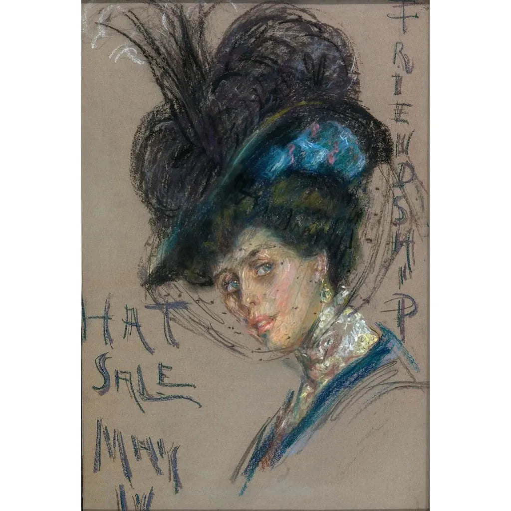 De verkoopposter van hoeden van Alice Pike Barney roept een tijdperk op waarin mode synoniem was met verfijning en elegantie. De delicate kleuren, die pastelkleuren combineren met fellere tinten, creëren een sfeer die zowel vrolijk als nostalgisch is. De techniek van de kunstenaar, die schilderen en illustratie combineert, brengt hoeden tot leven die versierd zijn met bloemen en linten, en trekt de aandacht en nodigt uit tot verbeelding. Elk detail is zorgvuldig doordacht en biedt een romantisch beeld van de vrouwelijke mode aan het begin van de 20e eeuw, waarin elk accessoire een verhaal vertelde.