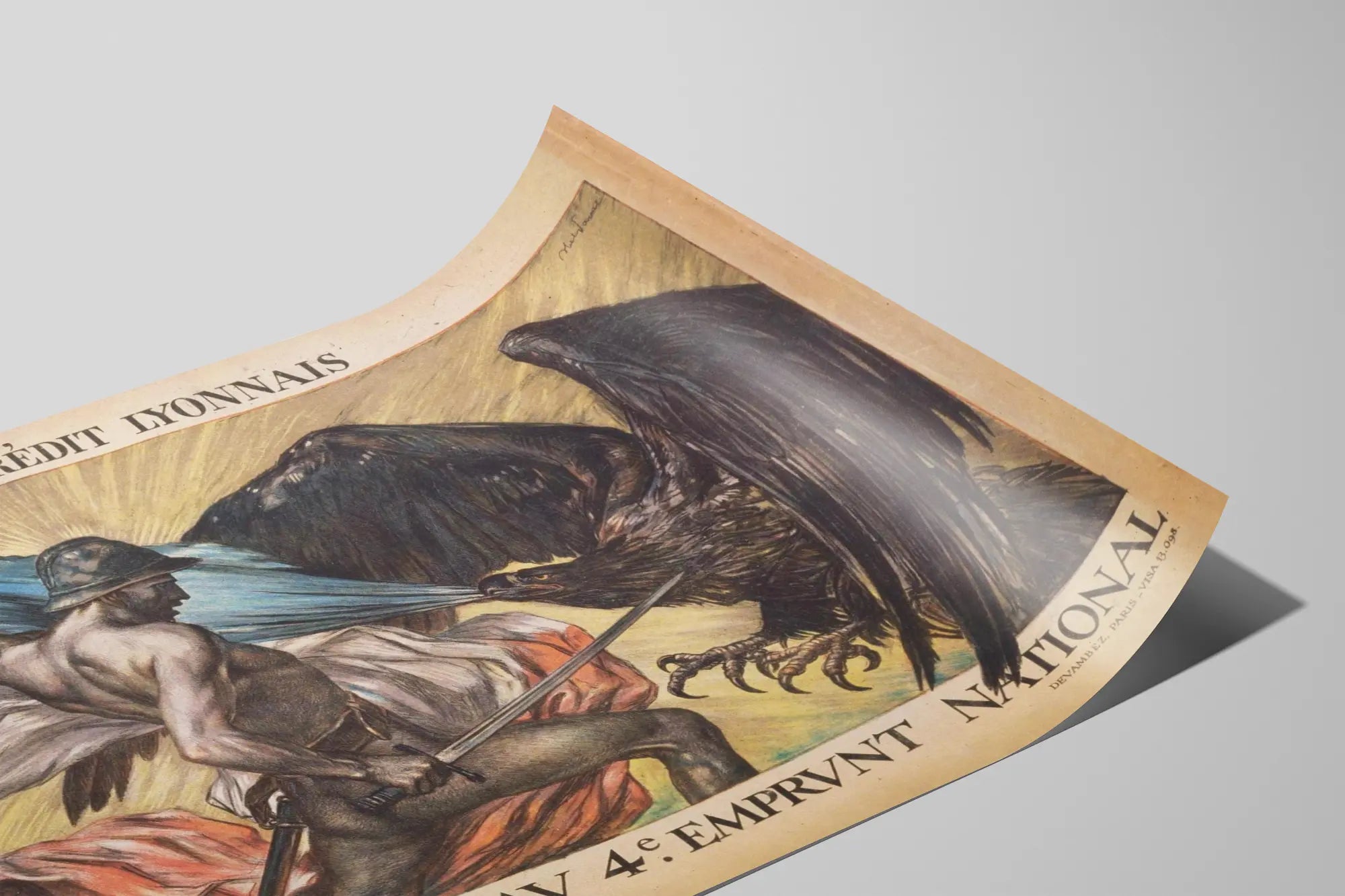 Découvrez cette affiche vintage historique mettant en scène un soldat en armure légère affrontant un aigle noir menaçant, symbole puissant dans la décoration murale d'époque. Cette affiche promotionnelle du Crédit Lyonnais incite à souscrire au 4ᵉ emprunt national, exprimant un message patriotique fort à travers une composition dramatique et un travail artistique minutieux. Cet objet d'art graphique ancien est idéal comme décoration murale pour les amateurs de posters historiques ou pour enrichir un intérieur avec une touche d'authenticité et d'histoire. L'image équilibrée et colorée, dominée par le drapeau tricolore français déployé en arrière-plan, apporte charme et profondeur à ce poster vintage. Ce tableau mural, fidèle à son époque, illustre une scène de confrontation puissante qui capte et retient le regard. Ce poster original est parfait pour une collection de décoration murale ou comme pièce maîtresse dans un espace dédié à l'histoire militaire ou à l'art graphique du début du XXe siècle. Apportez une ambiance unique à votre intérieur avec cette œuvre qui combine esthétisme et portée symbolique, valorisant ainsi le patrimoine visuel à travers un imprimé soigneusement réalisé.