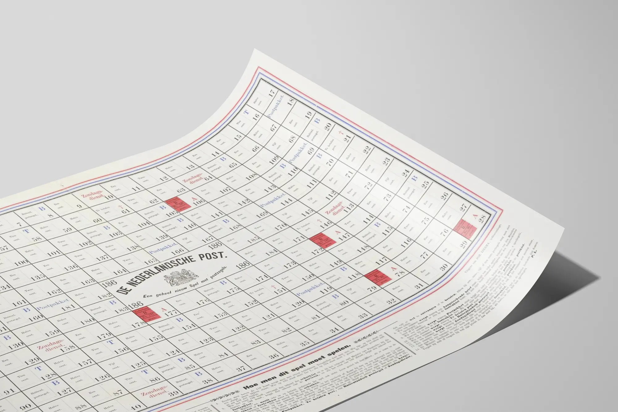 Cette affiche vintage intitulée "De Nederlandsche Post" présente un jeu de société basé sur les timbres-poste, une pièce rare idéale pour les amateurs d'histoire postale et de décoration murale unique. Ce poster captivant reprend un concept ludique ancien où les joueurs déplacent leurs pions sur une grille numérotée, chaque case comportant différentes valeurs en centimes et annotations relatives à l'utilisation des timbres et aux services postaux néerlandais. Les inscriptions en néerlandais et la disposition soignée du jeu sur un fond blanc avec des touches de bleu, rouge et noir offrent une esthétique graphique authentique. Ce tableau mural incarne un style rétro recherché, parfait pour apporter une touche d'originalité et de culture dans votre espace de vie. En décoration murale, cette affiche est aussi un hommage à l'univers de la philatélie, à travers un design structuré mêlant texte et chiffres, évoquant une pratique historique. Placer ce poster dans une pièce dédiée à la collection ou dans un bureau peut évoquer la passion pour les jeux de société traditionnels et la richesse du patrimoine postal. Cette décoration murale devient ainsi une invitation à la découverte et apporte une ambiance à la fois intellectuelle et esthétique. L'affiche peut également s'intégrer à une collection d'art graphique ou être utilisée comme un élément conversationnel dans un intérieur moderne ou vintage. Elle reflète une époque où la correspondance postale occupait une place centrale et où les timbres-poste étaient des objets de jeu et de collection. En résumé, ce poster "De Nederlandsche Post" est une pièce vintage idéale pour enrichir toute collection de décoration murale, apportant une touche de nostalgie et un intérêt culturel autour des jeux postaux anciens et des timbres.