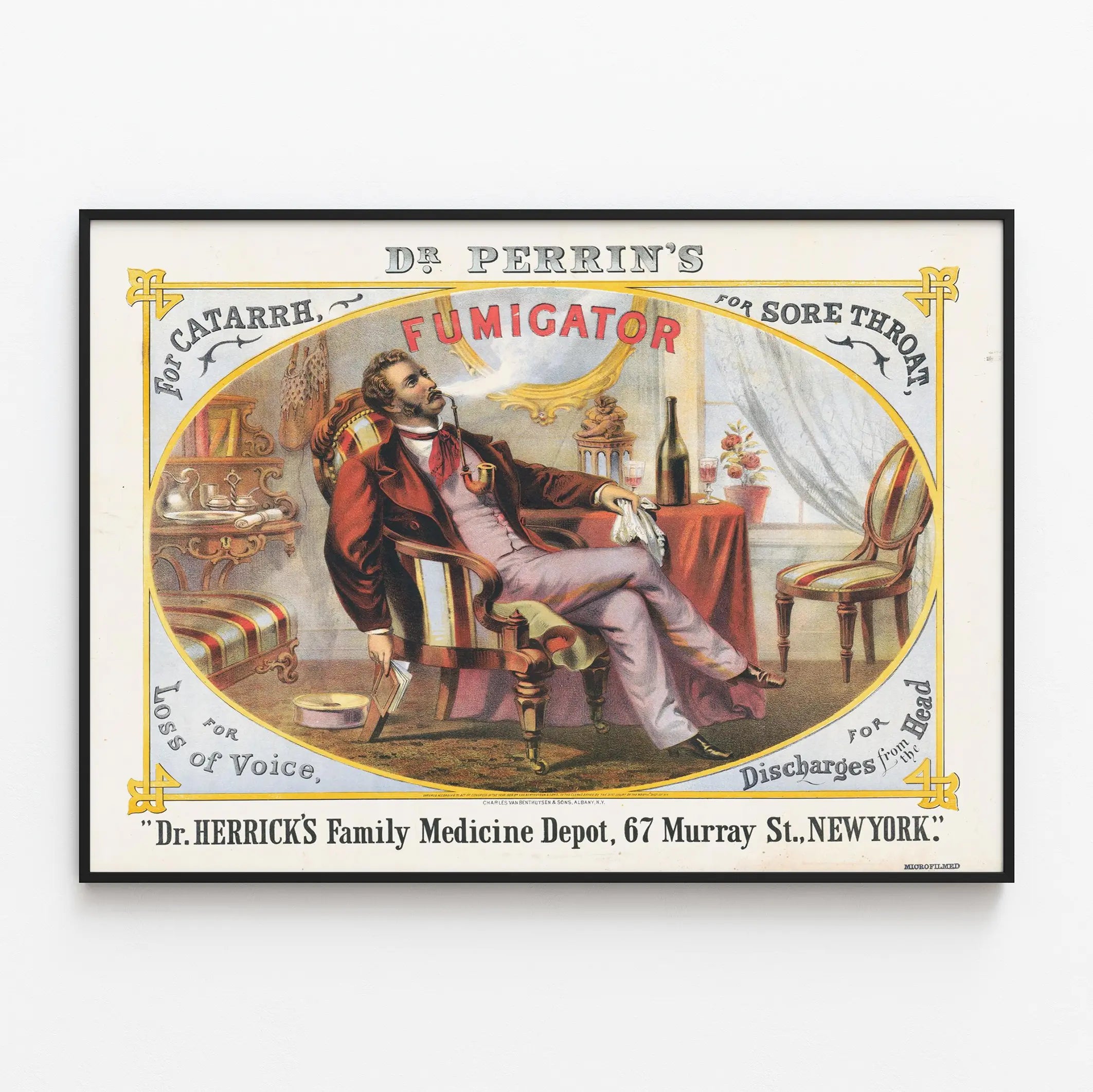 Cette affiche vintage illustre la publicité pour le "Fumigator" du Dr. Perrin, un produit ancien destiné à soulager plusieurs maux liés aux voies respiratoires supérieures. Représentant une scène intérieure élégante du XIXe siècle, elle montre un homme assis confortablement dans un fauteuil, utilisant un fumigateur pour traiter des affections telles que le catarrhe, le mal de gorge, la perte de la voix et les écoulements nasaux. Ce poster, riche en détails, met en avant les vertus médicinales supposées de l'appareil, comme indiqué en grandes lettres rouges au centre, et entouré de textes explicatifs en anglais."Décorative et informative, cette affiche constitue une décoration murale originale à la fois pour les amateurs d'art publicitaire vintage et pour ceux qui apprécient les ambiances d'époque. La qualité de l'illustration fait ressortir les nuances de couleurs des vêtements, du mobilier classique et du fumigateur en action. Une table couverte d'une nappe rouge, des verres et un bouquet de fleurs ajoutent une touche d'intimité à la scène. Placée dans un cadre adéquat, cette affiche vintage sera un élément attractif pour une décoration murale dans un intérieur au style rétro ou dans une collection sur le thème de la médecine ancienne. Elle évoque à la fois l'histoire des remèdes populaires et le charme graphique des affiches publicitaires d'autrefois.