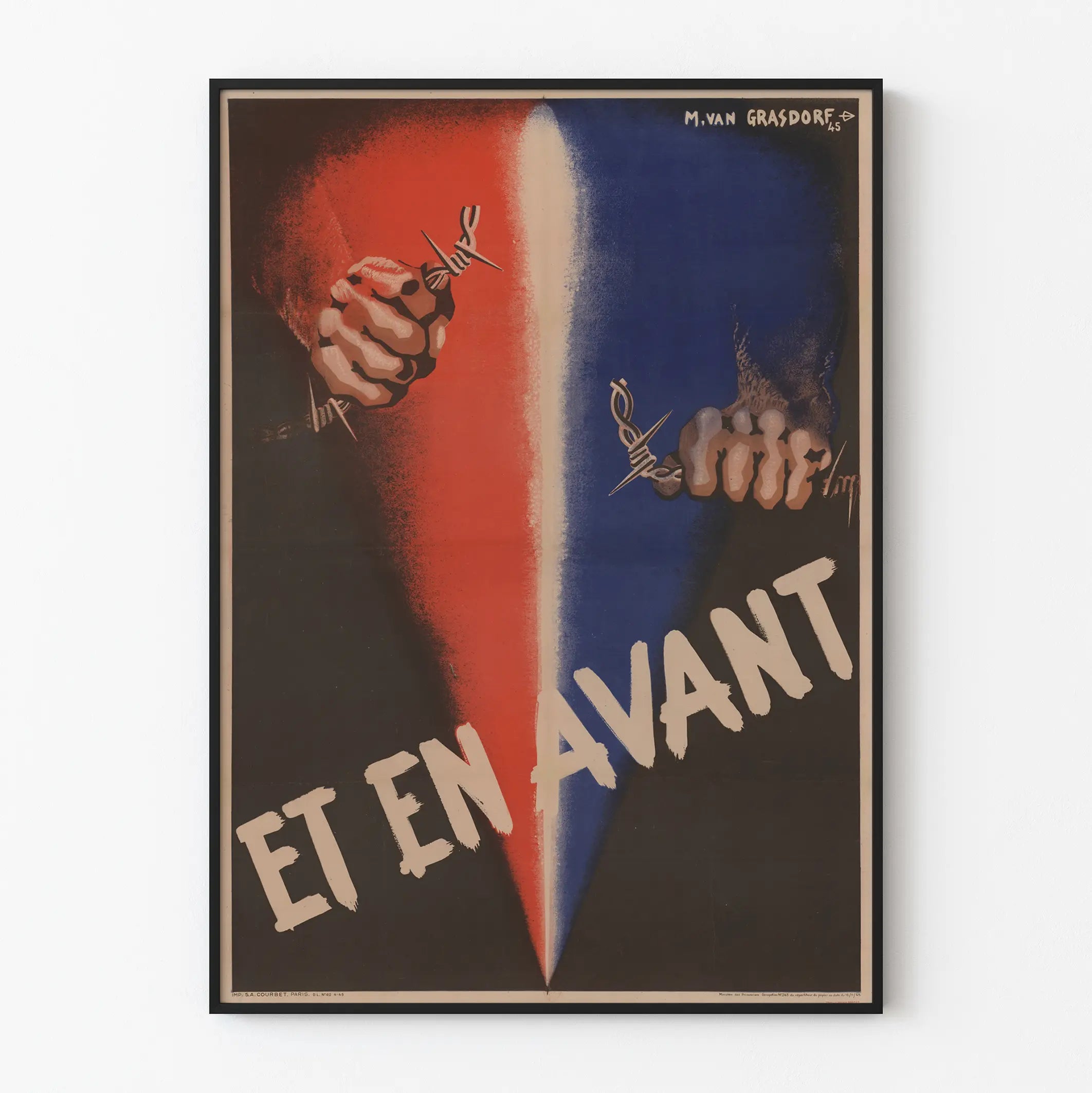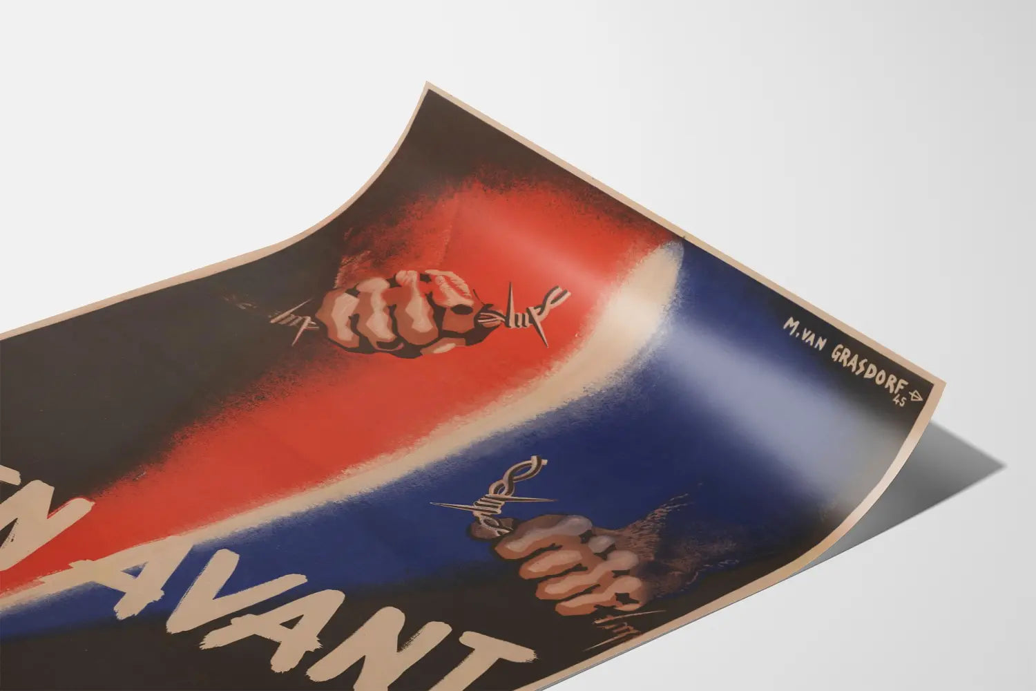 Deze vintage affiche met een krachtig grafisch ontwerp is een opvallend stuk voor elke muurdecoratie die een vastberaden en patriottische geest wil uitstralen. Ondertekend door M. Van Grasdorf in 1945, verspreidt ze een boodschap van dynamiek en vooruitgang met de inscriptie "EN VOORUIT" geschreven in gedurfde witte letters op een contrastrijk driekleurig achtergrond in rood, wit en blauw, de kleuren van de Franse vlag. Twee gesloten vuisten, symbolen van kracht en solidariteit, houden elk een zwaard gericht naar het midden van het beeld, wat het idee van eenheid en betrokkenheid versterkt. Deze grafische compositie combineert krachtig de strijdvaardige gebaar met het nationale symbool, waardoor het een decoratief object wordt dat geladen is met geschiedenis en betekenis. De poster past perfect in zowel moderne als klassieke interieurs, voor wie een vleugje energie, een strijdvaardige sfeer of een retro decoratiestuk wil toevoegen. Gebruikt als muurdecoratie, trekt dit gedrukt schilderij de aandacht door zijn opvallend chromatisch contrast en sterke visuele impact. Het vindt vanzelfsprekend zijn plek in een kantoor, woonkamer of vergaderruimte, en brengt een historische en gepassioneerde dimensie in de ruimte. Deze poster is ook een origineel cadeau-idee voor liefhebbers van geschiedenis, grafische kunst of iconisch politiek affiche-ontwerp. Haar standpunt ter bevordering van vooruitgang en ontwikkeling klinkt krachtig door de decennia heen. Deze vintage affiche wordt zo een gedurfde visuele verklaring en een decoratief muurobject dat zowel esthetisch als symbolisch is.