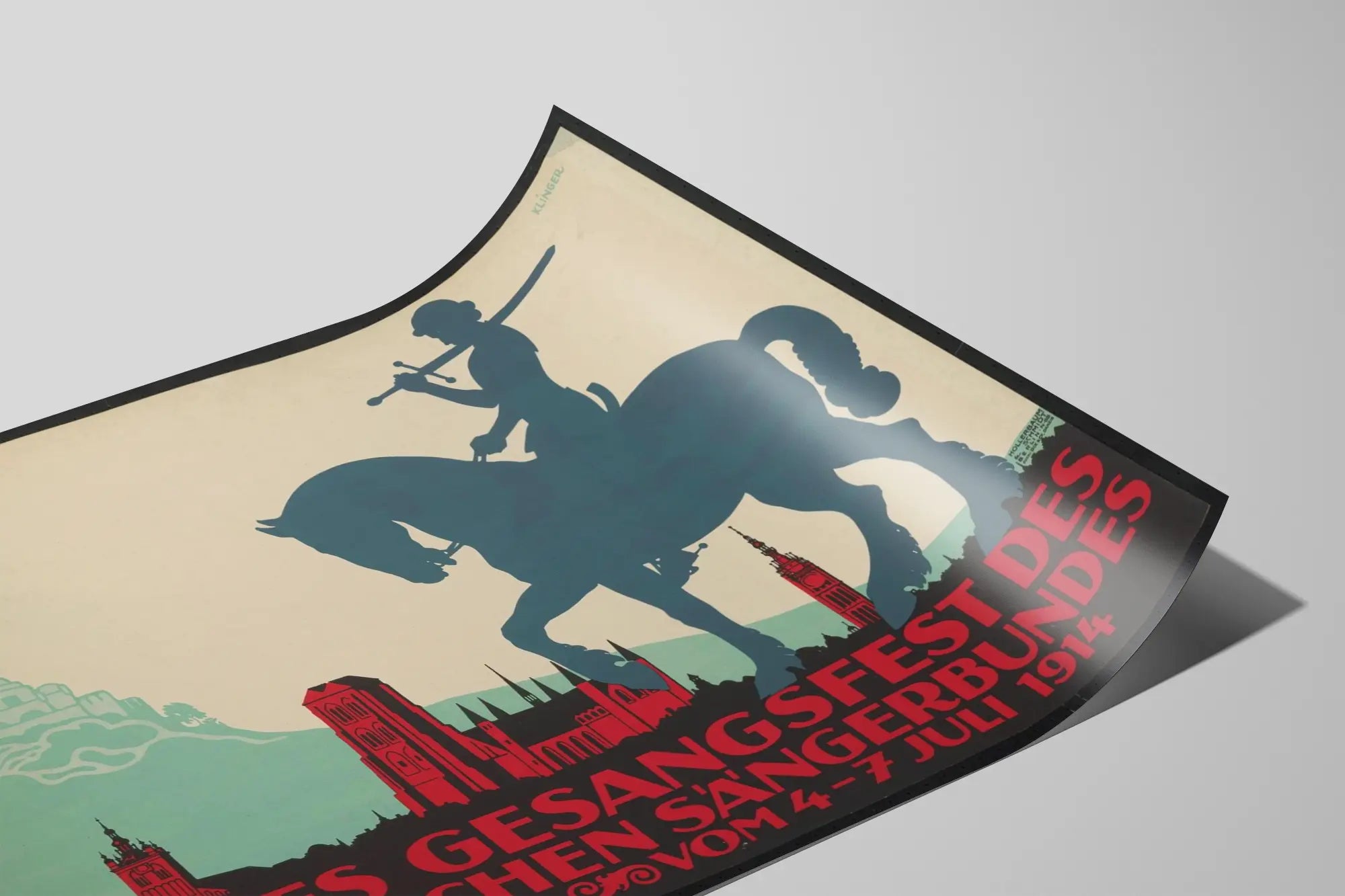 Cette affiche vintage originale célèbre le deuxième festival de chant du chœur prussien à Danzig, qui s'est tenu du 4 au 7 juillet 1914. Ce poster de décoration murale représente un cavalier silhouetté en bleu foncé, tenant une épée, sur un fond clair avec des édifices historiques dessinés en rouge et noir, symbolisant la ville de Danzig. On remarque également en haut à gauche une colombe émanant de rayons lumineux, posée au-dessus d'un monument stylisé, évoquant peut-être un cérémonial ou un symbole de paix et de culture. Le style graphique est épuré et utilise des formes contrastées et des couleurs limitées, typiques des affiches publicitaires du début du XXe siècle. Cette décoration murale se prête parfaitement aux intérieurs classiques ou vintage, apportant une touche d'histoire et d'élégance avec son design percutant et chargé de symboles. Ce tableau-poster est idéal pour les amateurs d'art graphique ancien, de culture européenne ou pour ceux souhaitant enrichir une collection de décorations murales historiques. Il représente aussi un bel hommage à la musique chorale et à l'événement culturel majeur qui a réuni les membres du chœur prussien à cette époque. Parfait pour une ambiance sophistiquée dans un salon, une bibliothèque ou un espace culturel, ce poster apporte caractère et authenticité grâce à son esthétique sobre et sa forte symbolique. Offrez à votre intérieur une décoration murale originale issue d'une époque révolue mais chargée de sens, grâce à ce visuel qui met en valeur l'alliance entre tradition, musique et héritage historique.