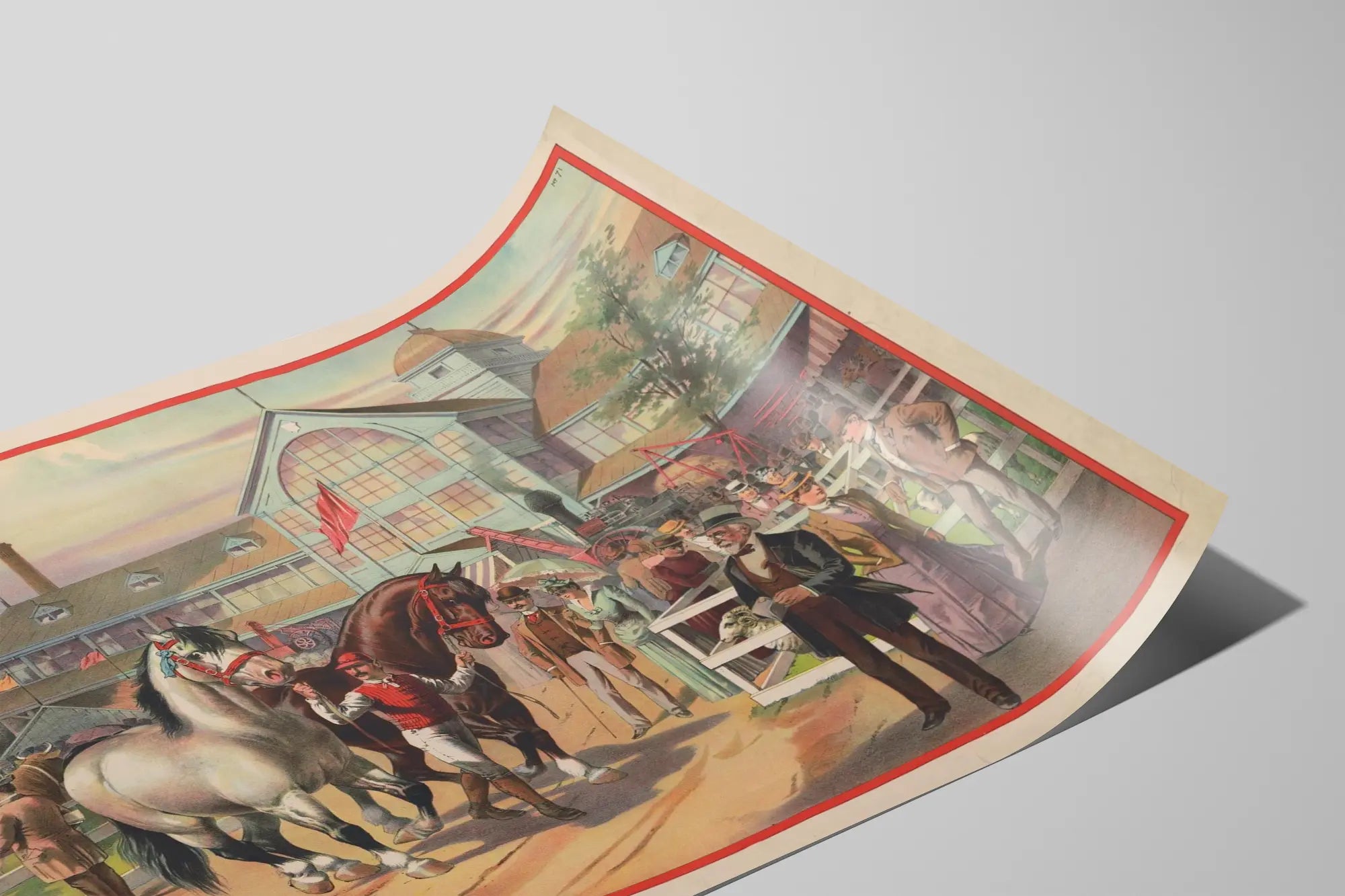 Cette affiche vintage représente une scène animée d'une foire agricole où se côtoient chevaux de trait, jockeys en tenue, et visiteurs élégamment habillés. Au premier plan, deux chevaux majestueux, l'un gris clair et l'autre marron foncé, sont tenus en main par des jockeys, leurs harnais rouges attirant le regard. Autour, plusieurs personnages en costumes d'époque observent ou discutent, créant une ambiance conviviale et authentique. La scène est enrichie par la présence d'animaux d'élevage dans des enclos, notamment des vaches et des moutons, accentuant l'esprit agricole et rural. En arrière-plan, un grand bâtiment industriel au style architectural ancien, avec des verrières, des cheminées fumantes et une éolienne, souligne la fusion entre la tradition agricole et la modernité industrielle du XIXe siècle. Un chien en mouvement apporte une touche de vie et de spontanéité à la composition. Ce poster au style lithographique séduit par ses couleurs douces et ses détails riches, parfait pour une décoration murale originale et chargée d'histoire. Il convient particulièrement aux amateurs d'art ancien, d'histoire rurale, ou de scènes champêtres. Idéal pour habiller un salon, un bureau ou une salle à manger, ce tableau imprimé est une invitation à voyager dans le temps et à découvrir l'ambiance d'une foire agricole traditionnelle. Sa qualité visuelle et son esthétique soignée en font une pièce maîtresse pour toute collection d'affiches décoratives thématiques.