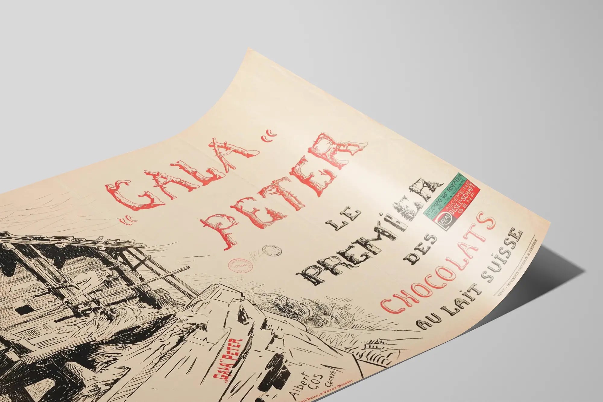 Apportez une touche rétro et authentique à votre décoration murale avec cette affiche publicitaire vintage intitulée "Gala Peter, le premier des chocolats au lait suisse". Ce poster imprimé en noir et rouge met en scène une illustration détaillée et élégante d'une structure traditionnelle en bois, probablement un chalet ou un grenier typique des régions alpines suisses, symbolisant la richesse et l'authenticité du chocolat suisse. Les lettres manuscrites en rouge et noir, « GALA PETER » et « Le premier des chocolats au lait suisse », offrent un contraste visuel saisissant et attirent l'œil vers le message publicitaire classique. Cette œuvre est imprimée sur un fond crème, suggérant un style ancien qui conviendra parfaitement aux amateurs de décoration vintage ou aux passionnés d'histoire du chocolat. Ce tableau mural est idéal pour rehausser l'ambiance d’un salon, d'une cuisine ou d’un espace dédié aux gourmandises, offrant une atmosphère chaleureuse et nostalgique. Il s’agit d’un poster unique qui célèbre l'héritage du chocolat au lait suisse et sa reconnaissance internationale. Décorer vos murs avec cette affiche donnera également un charme artisanal et un caractère vintage à votre intérieur, mêlant culture suisse et élégance graphique. Profitez de cette décoration murale pour mettre en avant une pièce iconique de la publicité ancienne, parfaite pour côtoyer d'autres éléments décoratifs comme des cadres en bois ou métal, des objets de collection vintage ou des affiches au style rétro. Ce poster, tout en offrant une qualité visuelle remarquable, convient particulièrement aux passionnés de chocolats et d'art graphique ancien. Faites revivre chez vous l'histoire du chocolat au lait suisse avec ce tableau d'affichage raffiné et plein de charme.