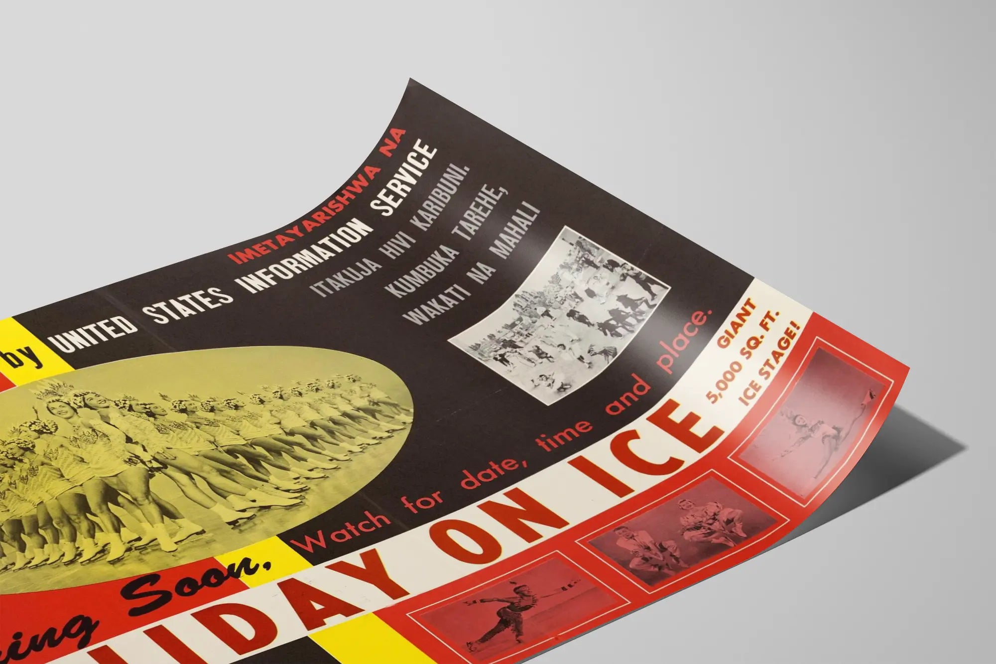 Découvrez cette affiche vintage intitulée "Holiday on Ice", parfaite pour une décoration murale unique et chargée d'histoire. Cette affiche met en avant un spectacle sur glace d'une immense scène de 5 000 pieds carrés, illustrée par un alignement élégant de patineurs artistiques habillés en costumes scintillants. Cette œuvre publicitaire d'époque, sponsorisée par le "United States Information Service", combine habilement des couleurs vives comme le rouge, le jaune et le noir, avec des photographies et textes multilingues qui ajoutent une dimension authentique et internationale à la pièce. Ce poster vintage de style graphique rétro est idéal pour les passionnés de décoration murale recherchant une touche d'originalité et de nostalgie. Ses éléments visuels attachants incluent notamment la grande rangée de patineurs en plein mouvement, ainsi que plusieurs petites images en noir et blanc montrant des scènes complémentaires du spectacle. Les polices de caractères variées, en particulier le lettrage rouge vif de "HOLIDAY ON ICE", renforcent l'impact visuel et attirent le regard. Parfait pour une mise en valeur dans un intérieur contemporain ou classique, cette affiche peut être encadrée comme un tableau ou utilisée seule en poster pour habiller un mur de salon, bureau ou espace de loisirs. Elle offre un style décoratif personnalisé qui évoque l'élégance des spectacles artistiques sur glace tout en s'inscrivant dans une tendance vintage très prisée. En intégrant cette décoration murale à votre collection Artem Legrand, vous invitez un air de spectacle et d'histoire dans votre espace. Ce poster est aussi un cadeau original pour les amateurs de patinage, de vintage, ou de graphisme d'époque. Grâce à sa composition en couleurs harmonieuses et son message multilingue, il s'adapte à divers styles d'aménagement intérieur visant à sublimer vos murs.