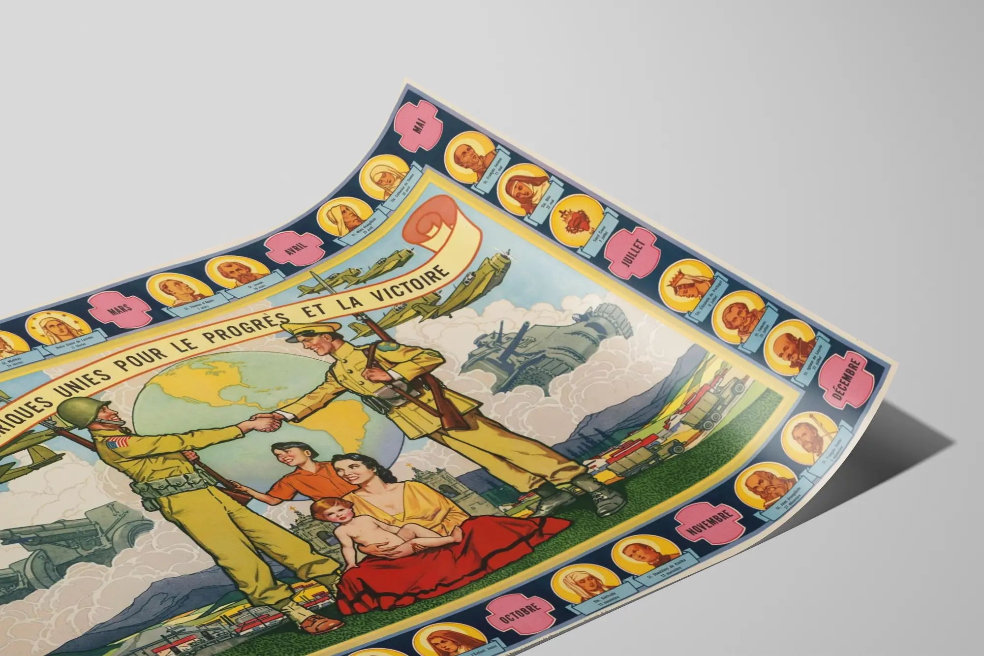Cette affiche est idéale pour une décoration murale authentique, parfaite pour les amateurs d’histoire, de mémoires de conflits et de symboliques patriotiques. Son style graphique et ses couleurs vives en font un poster attrayant qui s’adapte aussi bien dans un salon, un bureau ou une bibliothèque. Ce tableau mural vintage s’inscrit dans une thématique de propagande positive affichant la fraternité internationale et la lutte commune pour un avenir meilleur.