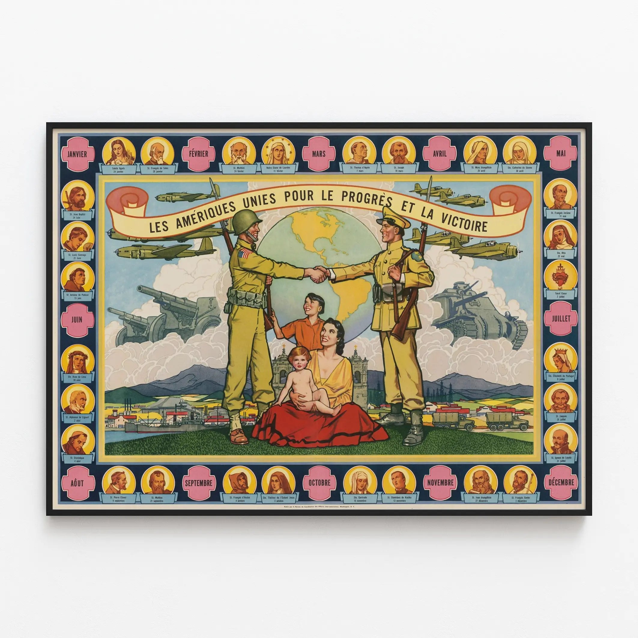 Découvrez cette affiche vintage intitulée "Les Amériques Unies pour le Progrès et la Victoire", une pièce de décoration murale riche en symboles et en histoire. Ce poster met en scène deux soldats sains et souriants, l’un américain et l’autre latino-américain, qui se serrent la main devant un globe terrestre mettant en valeur le continent américain. Cette image emblématique véhicule un message d’unité et de solidarité entre les Amériques, notamment dans un contexte de conflit ou de mobilisation.