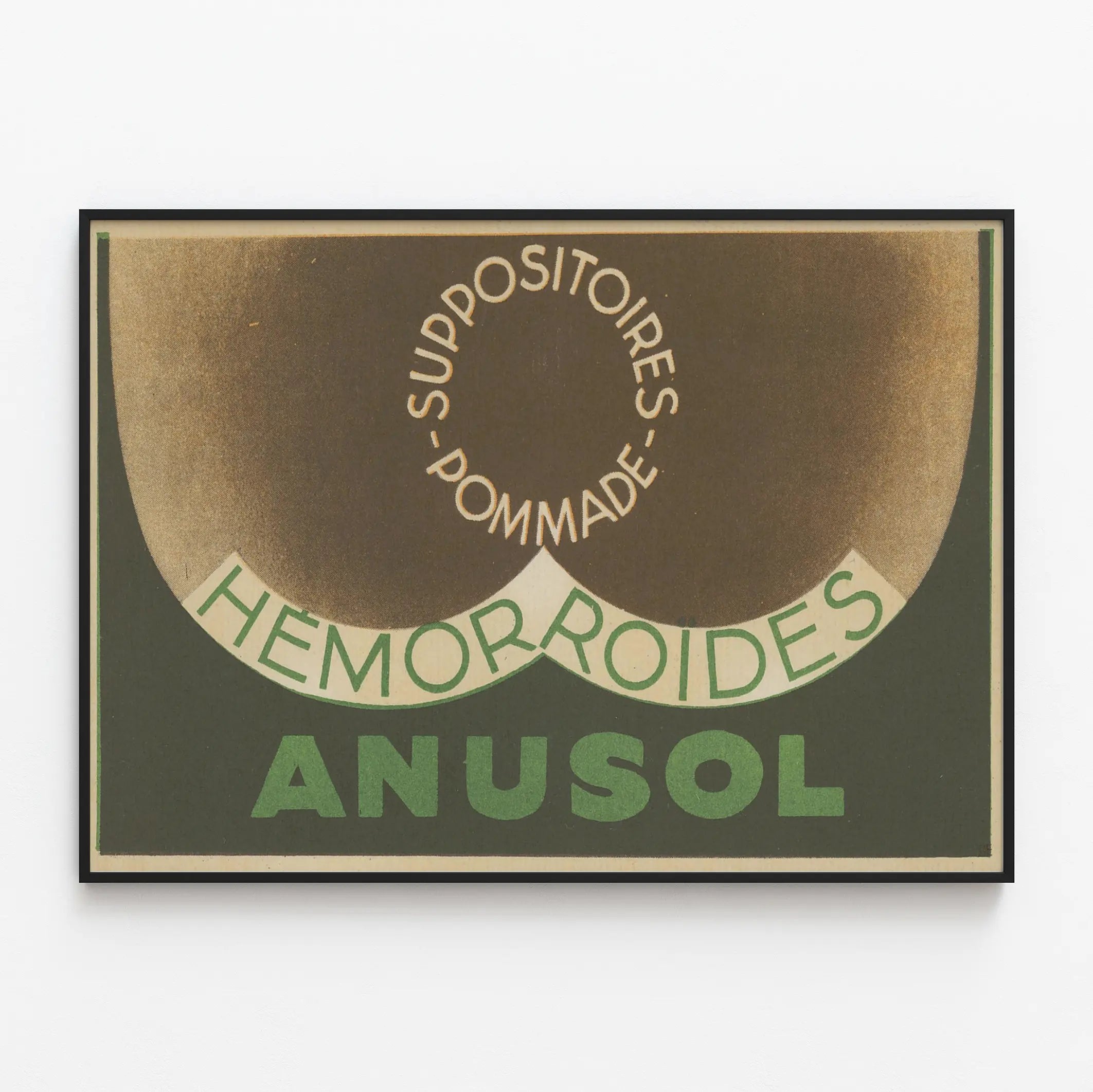 Deze vintage reclameposter van Anusol is een opvallend wanddecoratiestuk met een grafisch en typografisch ontwerp. Ze benadrukt op gedurfde en humoristische wijze een vermeend verzorgingsproduct bedoeld voor de behandeling van aambeien, afgebeeld door een abstracte voorstelling die de betrokken lichaamszone suggereert. De cirkelvormige tekst "SUPPOSITOIRE - ZALF" benadrukt de medische aard van het object, terwijl de woorden "AAMBEIEN" en "ANUSOL" domineren in groene letters op een donkere achtergrond.