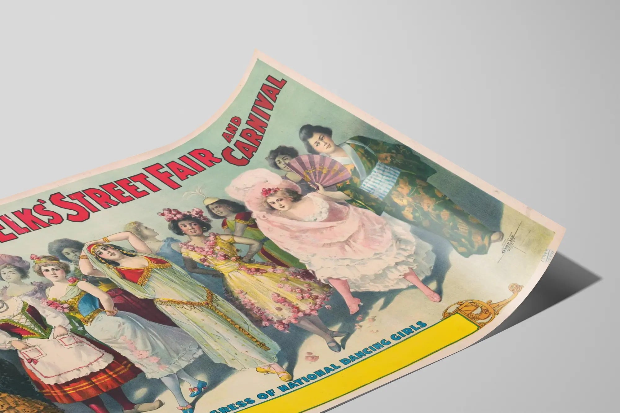 Ontdek deze vintage affiche die de Midway Elks Straatfeest en Karnaval afbeeldt, met een elegante nationale danserscongres. Deze unieke wanddecoratie illustreert een levendige carnavals scène met dansers in kleurrijke en gevarieerde kostuums, die verschillende culturen en tijdperken symboliseren. De keuze van felle, contrasterende kleuren, de details van de kostuums en de evenwichtige compositie maken er een boeiend decoratief stuk van voor elke binnenruimte. Deze poster roept de feestelijke sfeer van beurzen en carnavals op, met een vleugje authentieke geschiedenis, ideaal om een retro en artistieke toets aan uw muurdecoratie toe te voegen. Perfect om een woonkamer, kantoor of speelkamer te verrijken, is dit gedrukt schilderij een eerbetoon aan de diversiteit en elegantie van traditionele dansvoorstellingen. De vintage grafische presentatie en de vrolijke boodschap brengen ook een gezellige en warme sfeer aan de muren. Deze affiche richt zich op liefhebbers van unieke en culturele wanddecoratie, die een interieur willen creëren dat zowel dynamisch als esthetisch is.