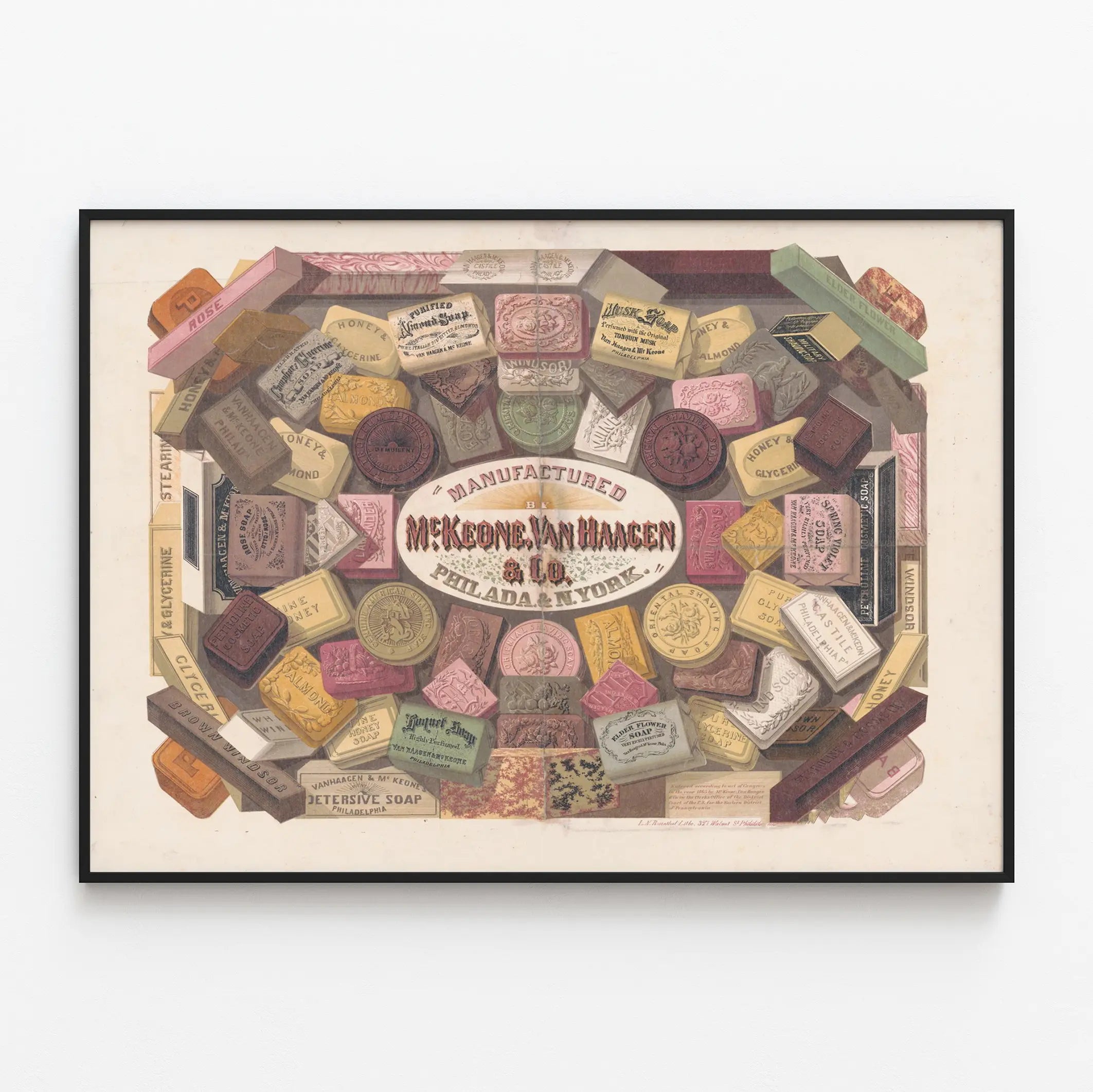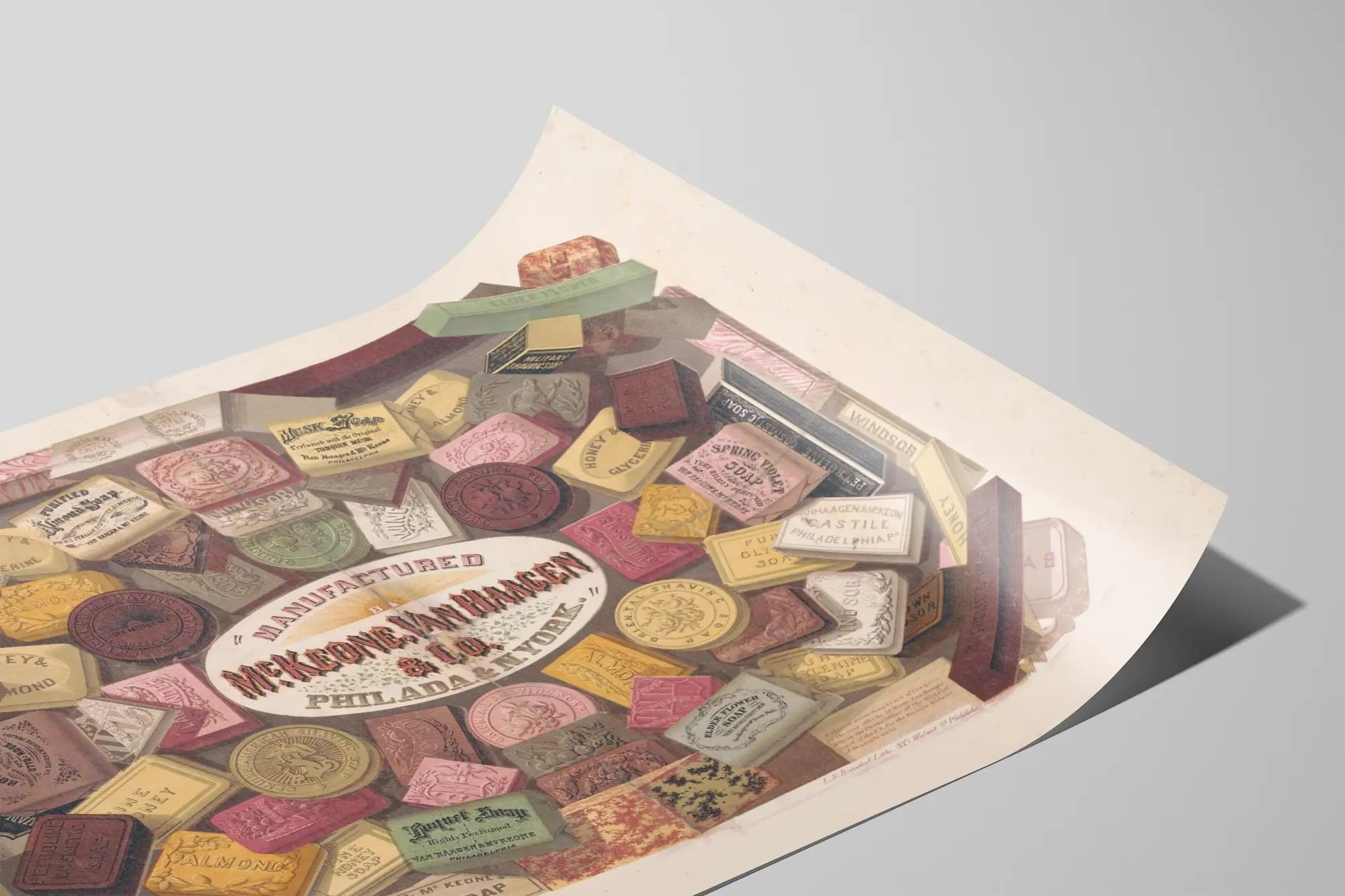 Deze vintage affiche toont een elegante en kleurrijke compositie van zepen vervaardigd door McKeone Van Haagen & Co, een bedrijf gevestigd in Philadelphia en New York. Men ziet een verscheidenheid aan zepen in verschillende vormen, staafjes, rechthoeken en ronde exemplaren, elk subtiel afgebeeld met diverse inscripties en patronen. De zepen dragen namen zoals "Rozenzeep", "Honing & Amandel", "Musk Zeep", "Oosters Scheerzeep" of "Vlierbloesem Zeep", wat een breed scala aan geuren en verfijnde cosmetische eigenschappen oproept. Deze waaierachtige compositie benadrukt de diversiteit van de producten in een stijl die typerend is voor oude reclameposters, met een combinatie van grafische verfijning en visuele rijkdom. Het oude lettertype dat rondom de zepen is gebruikt, vooral op de centrale tekst "Gemaakt door McKeone Van Haagen & Co. Philada. & N. York.", versterkt het retro- en authentieke karakter van deze wanddecoratie. Deze poster is ideaal voor liefhebbers van vintage decoratie die een vleugje geschiedenis en elegantie aan hun interieur willen toevoegen. Door zijn retrostijl leent deze affiche zich uitstekend voor een accent in een badkamer of een ruimte die gericht is op welzijn en schoonheid. Het gedetailleerde en kleurrijke formaat biedt een origineel en karaktervol middelpunt op een muur, tussen moderniteit en nostalgie. De verschillende zeepblokken en hun etiketten vormen een mooie samensmelting van reclame en decoratieve kunst, waardoor deze poster een tijdloze charme krijgt die gewaardeerd wordt door liefhebbers van authentieke muurdecoratie. Deze retro afbeelding nodigt uit tot herontdekking van de wereld van traditionele zepen in een zorgvuldig grafisch ontwerp, ideaal om een collectie vintage affiches te verrijken of een thematisch decoratief geheel te vormen in een modern of klassiek interieur.