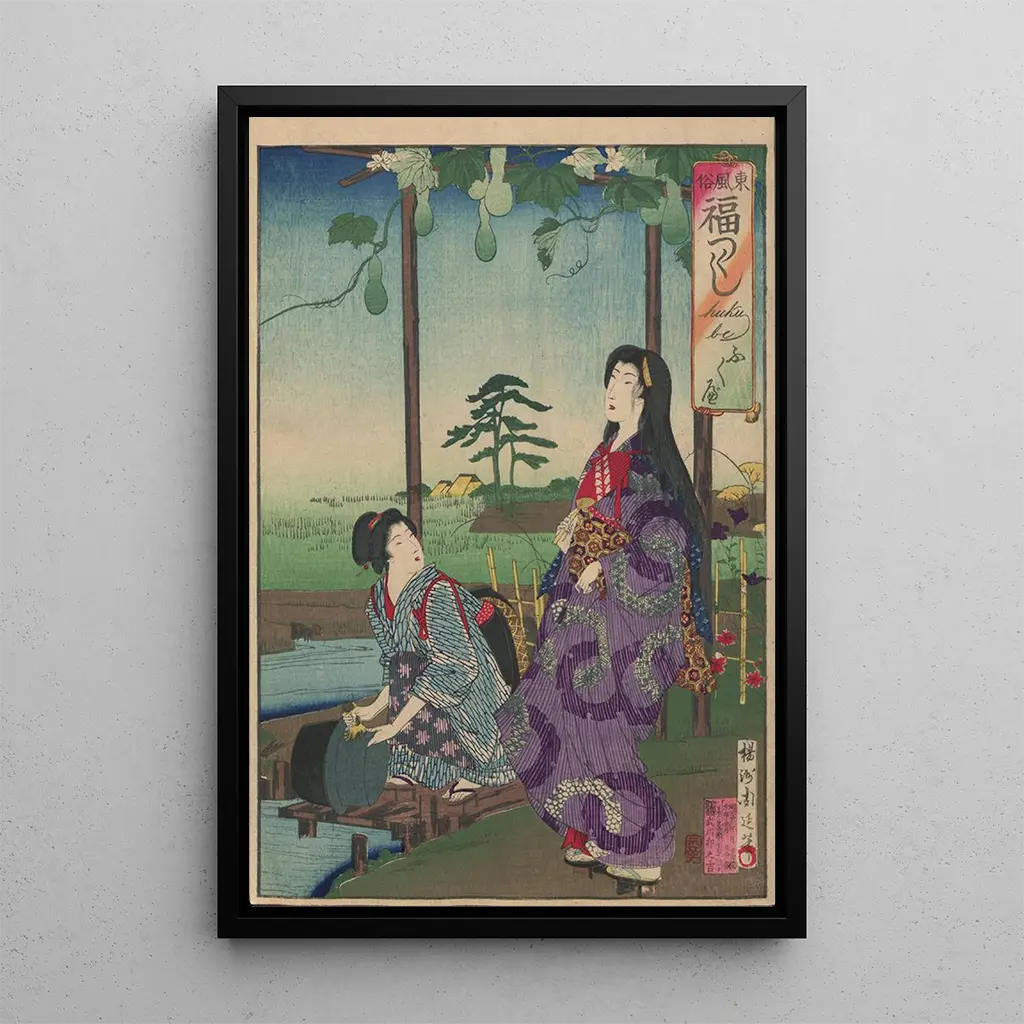 "L'Album de Nishikie Pl19" van Toyohara Chikanobu is een kunstdruk die de vluchtige schoonheid van het traditionele Japanse leven oproept. Deze kunstdruk wordt gekenmerkt door levendige kleuren en delicate patronen, typisch voor ukiyo-e prenten. Chikanobu excelleert in het vastleggen van scènes uit het dagelijks leven, waarin de personages, vaak omringd door betoverende landschappen, lijken te bloeien in een sfeer van sereniteit. Elk detail, van de versierde kleding tot de bloemrijke achtergronden, draagt bij aan een poëtische en nostalgische sfeer, die de kijker uitnodigt zich onder te dompelen in een wereld van vergankelijke schoonheid.