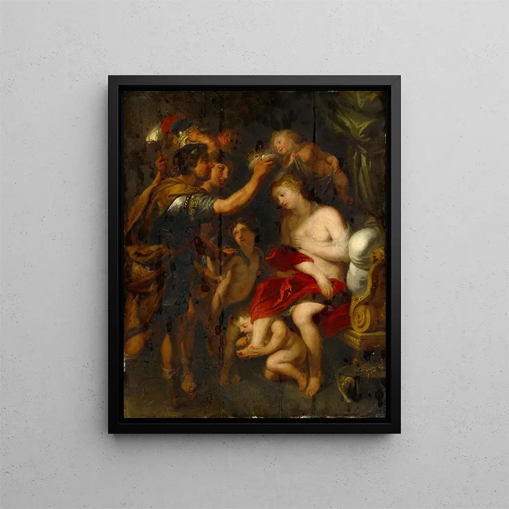 Reproductie Alexandre en Roxane - Anoniem – Boeiende introductie L'œuvre "Alexandre en Roxane" wordt gepresenteerd als een ware venster naar een vervlogen wereld, waar liefde en verovering samenkomen in een ballet van kleuren en vormen. Dit anonieme stuk, dat de epische verhalen uit de oudheid oproept, transporteert ons naar het fascinerende universum van Alexander de Grote en zijn geliefde Roxane. Door deze kunstdruk slaagt de kunstenaar erin de essentie van hun verhaal vast te leggen, waarbij passie en moed worden verenigd in een compositie die zowel dynamisch als poëtisch is. De kunstdruk nodigt de kijker uit om zich onder te dompelen in een rijke visuele vertelling, waarin elk detail een deel van het verhaal van deze iconische personages vertelt. Stijl en uniekheid van de kunstdruk De stijl van "Alexandre en Roxane" onderscheidt zich door een benadering die zowel klassiek als romantisch is. De levendige kleuren en de expressieve trekken van de personages tonen een onmiskenbare technische meesterschap, getuigend van een tijd waarin kunst de schoonheid en heldhaftigheid moest vieren. De compositie is zorgvuldig georkestreerd, elk element is zodanig geplaatst dat het de blik van de kijker door de scène leidt. De gezichten van de hoofdpersonen, vol emotie, lijken bijna levend, terwijl de plooien van de kleding beweging en vloeiendheid toevoegen. Deze kunstdruk beperkt zich niet tot het weergeven van een historische scène; ze roept ook universele gevoelens op zoals liefde, passie en opoffering, en raakt zo het hart van degenen die het bekijken. De kunstenaar en zijn invloed Hoewel de kunstenaar van "Alexandre en Roxane" anoniem blijft, is het onmiskenbaar dat zijn werk deel uitmaakt van een rijke en gevarieerde artistieke traditie. De invloed van grote meesters uit de klassieke schilderkunst is voelbaar, maar deze kunstdruk onderscheidt zich door haar vermogen om diepe emoties op te roepen en een tijdloos verhaal te vertellen. Kunstenaars uit deze periode probeerden vaak heroïsche verhalen te immortalizeren, en deze schilderij vormt daarop geen uitzondering. Door zich te richten op de figuren van Alexander en Roxane, slaagt de kunstenaar erin de eenvoudige historische vertelling te overstijgen en er een reflectie over de menselijke natuur van te maken, over de aspiraties en verlangens die ons allen bewegen. Deze capaciteit om te raken