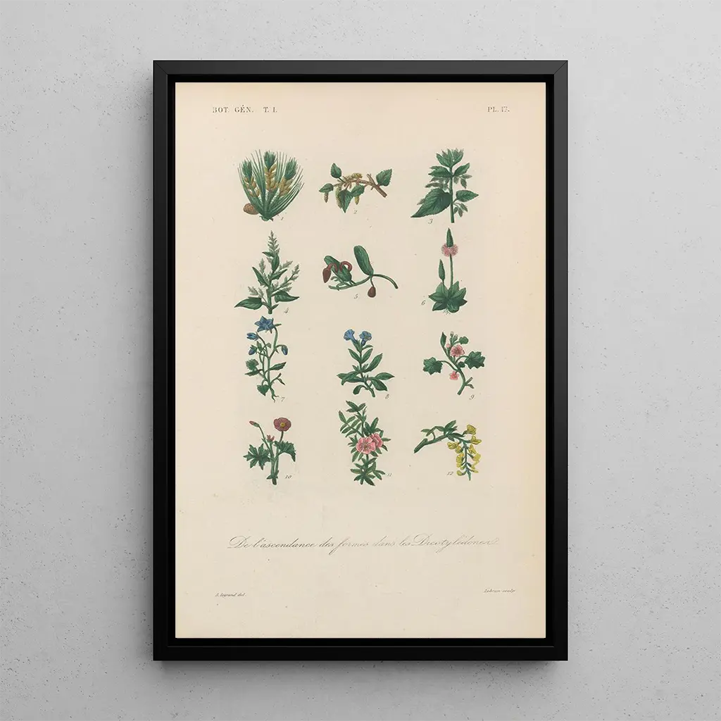 Het kunstdruk Traité de botanique générale Pl017 presenteert zich als een viering van de rijkdom van de plantwereld. De nuances van groen en de heldere kleuraccenten van de bloemen creëren een boeiende visuele harmonie. De gebruikte techniek, die aquarel en tekening combineert, maakt het mogelijk om elk detail met verbluffende precisie weer te geven. Dit kunstwerk nodigt uit tot een minutieuze verkenning, waarbij elke plant een onderwerp van verwondering wordt, en de verborgen schoonheid van de natuur onthult door een artistiek prisma.