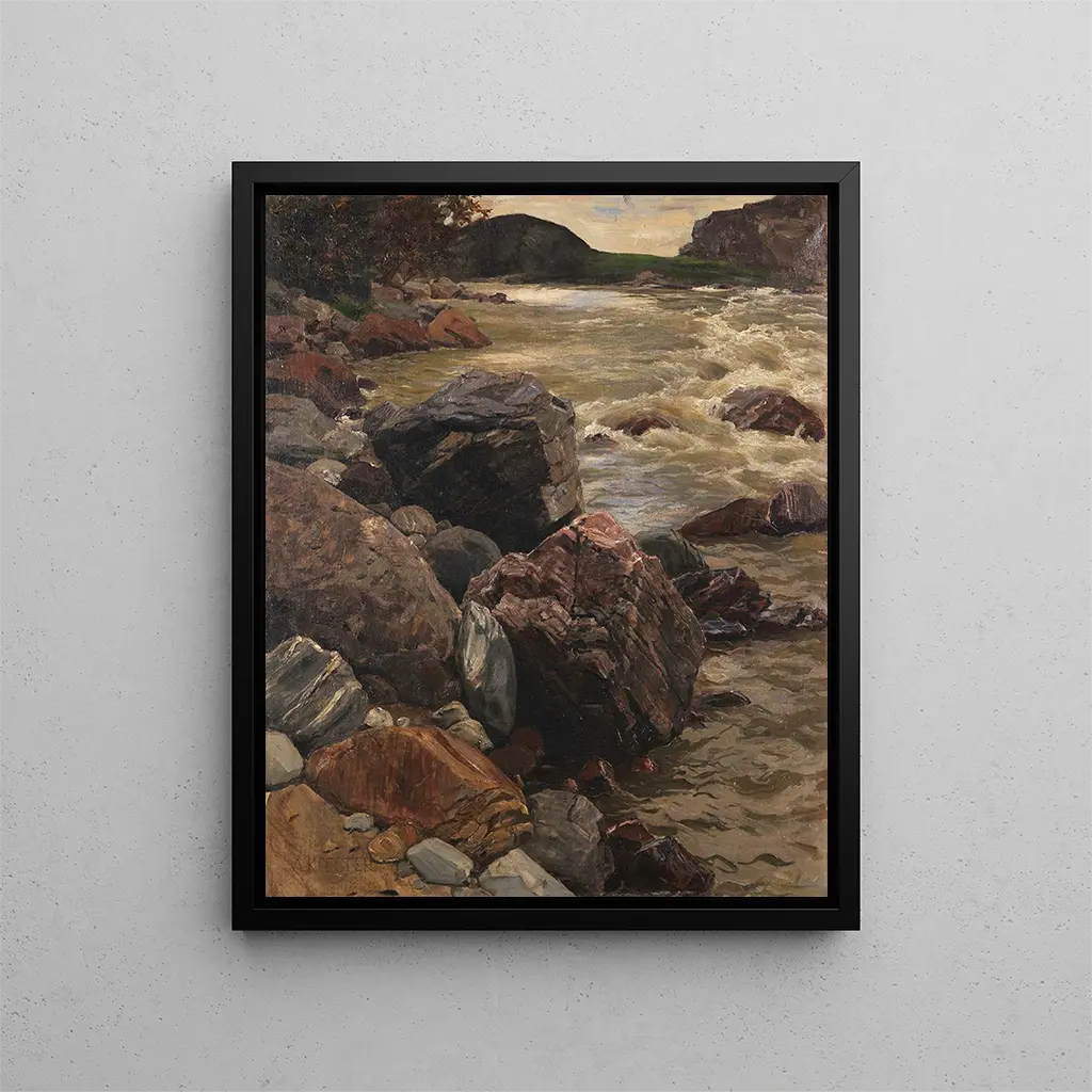 De stijl van Alexander Koester wordt gekenmerkt door een treffend realisme, waarbij elk detail minutieus wordt waargenomen en met opmerkelijke precisie wordt weergegeven. In "Am Eisack in Zuid-Tirol" slaagt de kunstenaar erin een sfeer van immediatesse te creëren, alsof je bijna het geruis van de rivieren en de adem van de wind in de bomen kunt horen. De compositie is zorgvuldig in balans, met natuurlijke elementen die op elkaar reageren en elkaar aanvullen. De lichtspelingen, versterkt door subtiele contrasten, brengen diepte aan de scène, waardoor het geheel een grote visuele rijkdom krijgt. Dit werk beperkt zich niet tot het reproduceren van een landschap, het drukt de ziel ervan uit en biedt de kijker een meeslepende en contemplatieve ervaring.