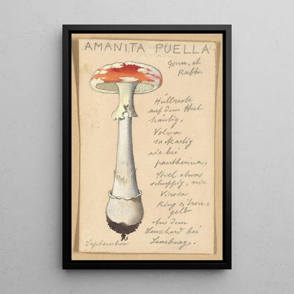 De kunstdruk van "Amanite puella" is een ideale keuze om uw woonruimte te verfraaien, of het nu een woonkamer, kantoor of slaapkamer betreft. De afdrukkwaliteit garandeert een uitzonderlijke fideliteit aan de nuances en details van het originele kunstwerk, zodat u volop kunt genieten van zijn charme. Met zijn delicate esthetiek brengt deze doek een vleugje sereniteit en elegantie in uw interieurdecoratie. Door te kiezen voor deze kunstdruk, kiest u voor een schilderij dat niet alleen uw omgeving verfraait, maar ook gesprekken en reflecties over de schoonheid van de natuur uitlokt.