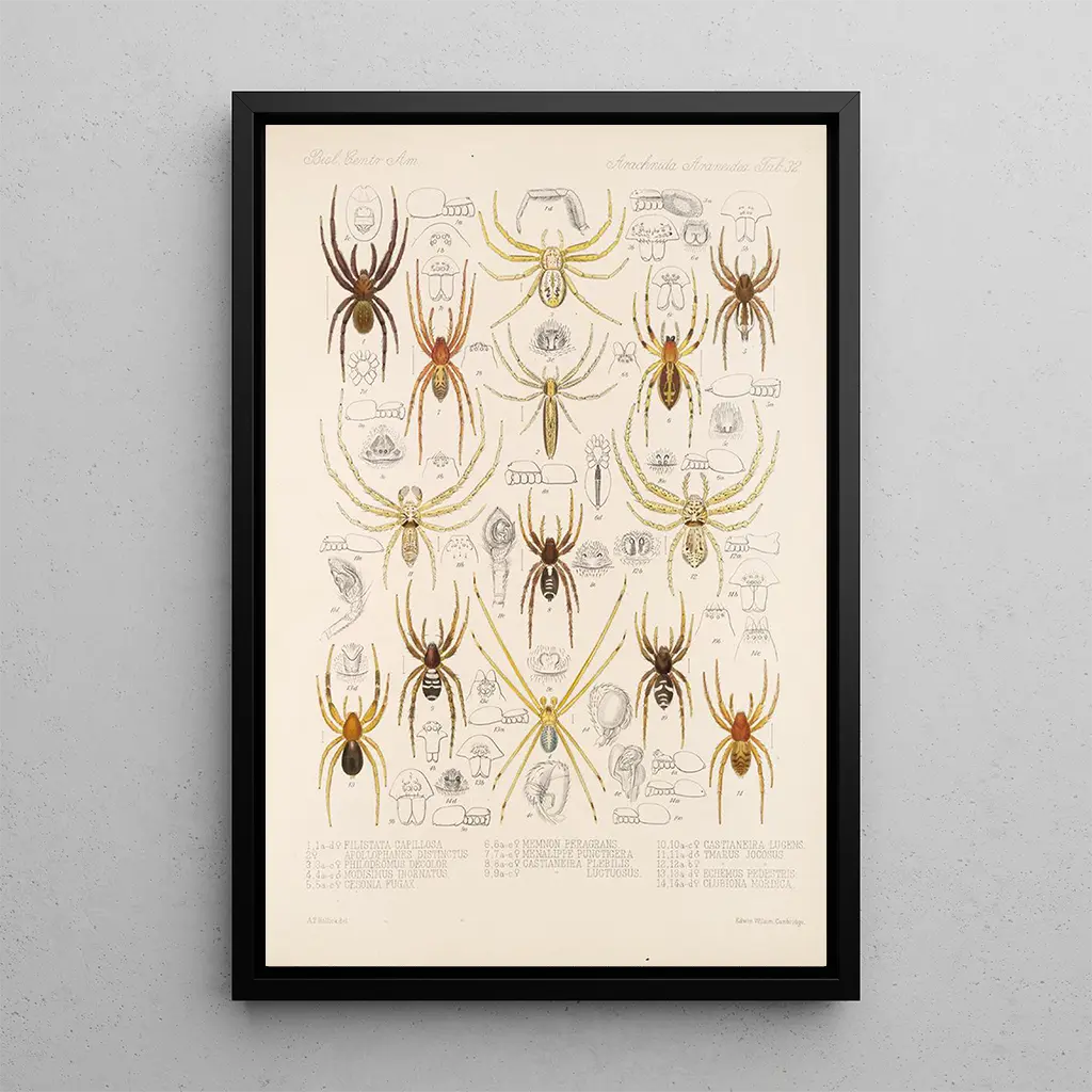 Het kunstdruk "Arachnida Araneidea Pl 32" van Frederick DuCane Godman dompelt ons onder in een fascinerend universum, waar de fijnheid van spinnen in de schijnwerpers staat. De minutieuze details van elk schepsel, weergegeven met zachte en natuurlijke kleuren, creëren een sfeer die zowel intrigerend als rustgevend is. De aquareltechniek, gecombineerd met precieze lijnen, maakt het mogelijk de essentie van deze spinachtigen vast te leggen, waarbij hun elegante vormen en unieke texturen worden onthuld. Deze kunstdruk nodigt uit tot een aandachtige contemplatie, waarbij elk element lijkt een verhaal te vertellen, dat van de vaak onbegrepen schoonheid van de wereld van spinnen.