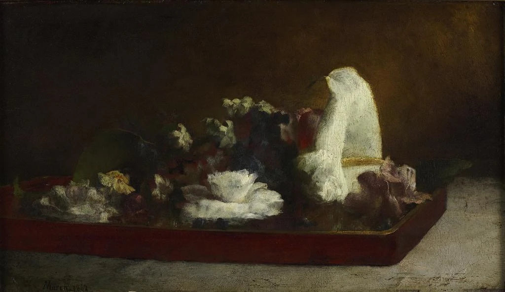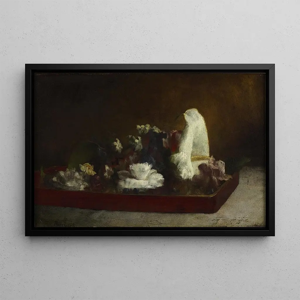 De doek "Arum" van John La Farge is een levendige viering van de natuur, waar de fijnheid van de bloemen samengaat met een palet van rijke en genuanceerde kleuren. De compositie, gericht op de elegante arum bloem, roept een sfeer van sereniteit en contemplatie op. Het spel van licht en schaduw, evenals de minutieuze details van de bloemblaadjes, getuigen van de technische meesterschap van de kunstenaar. Elke penseelstreek lijkt een eigen leven te geven aan dit werk, en nodigt de kijker uit om onder te dompelen in de vergankelijke schoonheid van de flora.