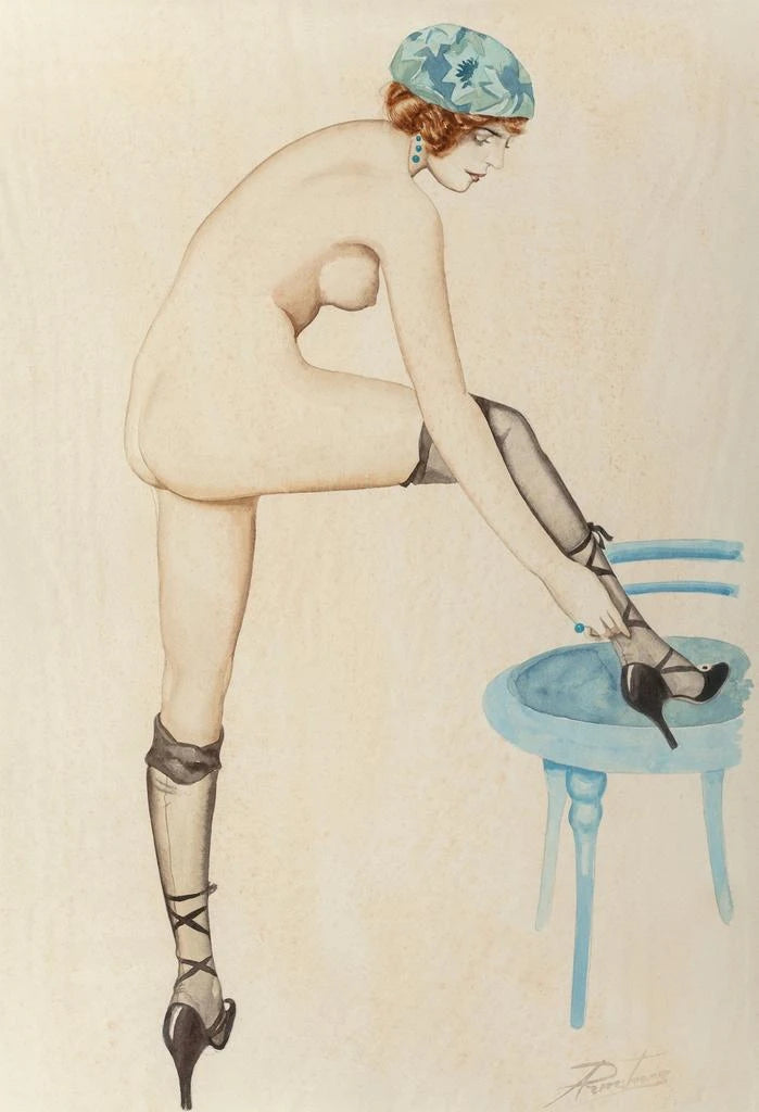De kunstdruk "Bas français" van Rolf Armstrong roept een gevoel van verfijning en sensualiteit op door zijn zachte kleuren en vloeiende lijnen. De compositie benadrukt een vrouw gekleed in een lichte jurk, waarvan de plooien lijken te dansen in de wind. De pastelkleuren, die tinten roze en blauw combineren, creëren een dromerige en romantische sfeer. Armstrong, meester in het portretteren van de vrouwelijke vorm, slaagt erin de essentie van schoonheid en gratie vast te leggen, en nodigt de kijker uit om onder te dompelen in een wereld van verfijning en charme.