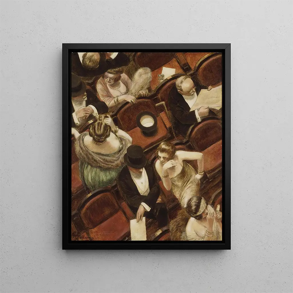 De stijl van Albert Guillaume onderscheidt zich door zijn subtiele realisme en zijn scherpzinnige observatievermogen. In "Van het theater" spelen de nuances van licht en schaduw een essentiële rol, waardoor een warme en omhullende sfeer ontstaat. De gezichten, fijn gedetailleerd, uiten een scala aan emoties variërend van opwinding tot melancholie, waarmee de complexiteit van de sociale relaties van die tijd wordt onthuld. Het kleurenpalet dat de kunstenaar heeft gekozen, met rijke en fonkelende tinten, benadrukt de rijkdom van de kostuums en de glans van de accessoires, waardoor elk personage een ware acteur op het toneel wordt. Dit schilderij wordt ook gekenmerkt door een slimme compositie, waarbij de blik wordt geleid door het tafereel, zodat de kijker de verschillende niveaus van deze theatrale voorstelling kan verkennen.