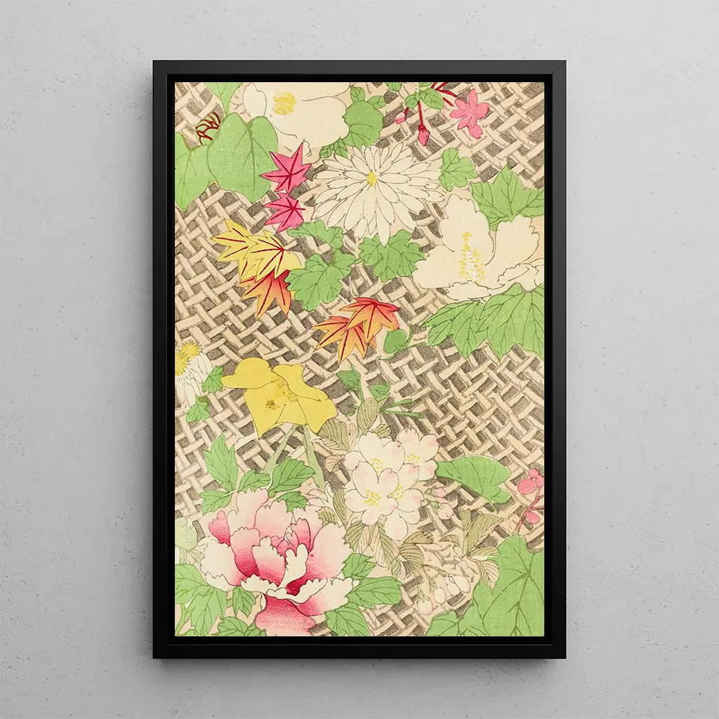 De kunstdruk van Bijutsukai Pl130 brengt ons in een wereld waar de schoonheid van bloemen wordt benadrukt met een opmerkelijke fijngevoeligheid. De pastelkleuren en bloemmotieven verweven zich om een evenwichtige en rustgevende compositie te creëren. Elk element van dit kunstwerk is zorgvuldig bedacht, wat getuigt van de technische meesterschap van Furuya Korin. De sfeer die van dit doek uitgaat, roept een innerlijke rust op en nodigt de kijker uit om even stil te staan en de pracht van de natuur te bewonderen.