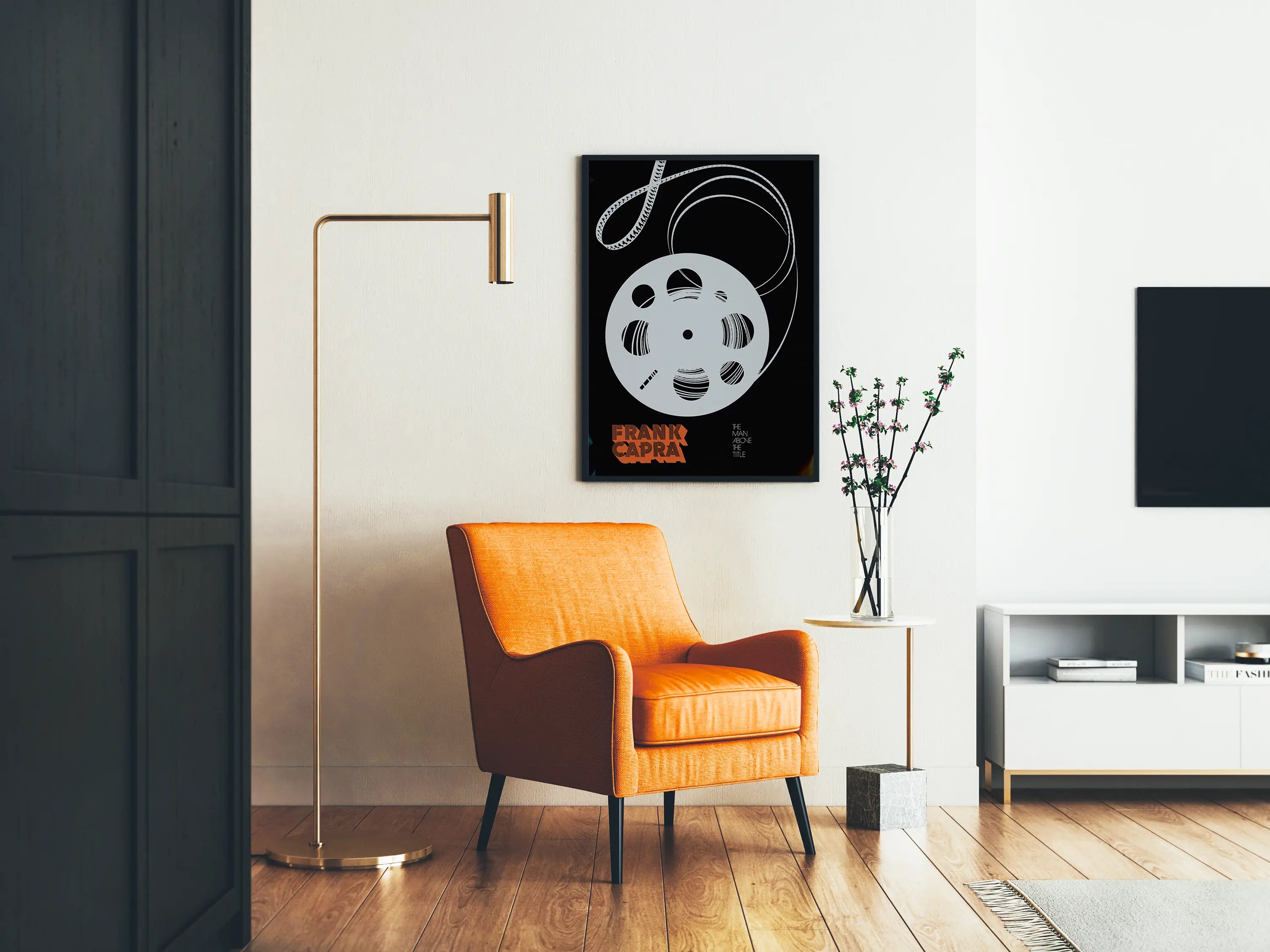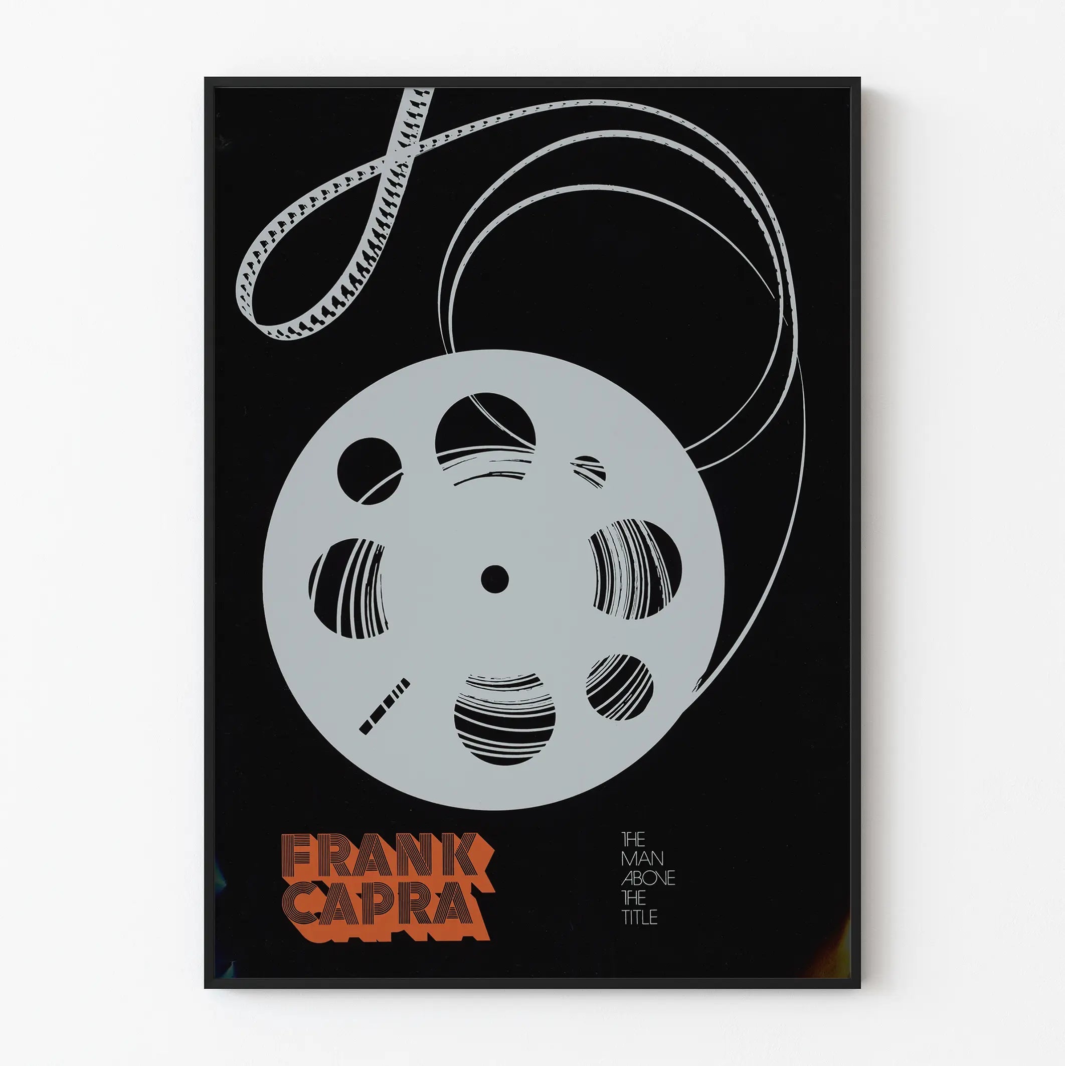 Deze wanddecoratieposter is een elegante en minimalistische eerbetoon aan de klassieke cinema, gericht op een grafisch motief dat een gestileerde filmrol in lichtgrijs op een zwarte achtergrond weergeeft. De subtiele details van de filmstrook die zich oprolt, geven een dynamische indruk en herinneren aan de kunst van filmmontage en het belang van de filmrol in de geschiedenis van de cinema. Het beeld wordt versterkt door de tekst "FRANK CAPRA" in oranje-rode hoofdletters met een geometrisch uiterlijk, evenals de ondertitel "THE MAN ABOVE THE TITLE" in wit met een fijne, moderne typografie. Deze wandposter is ideaal voor filmliefhebbers, audiovisuele creatieve studio's of elke binnenhuisdecoratie geïnspireerd door de zevende kunst. Ze brengt een vintage en artistieke sfeer, terwijl ze toch eigentijds blijft dankzij haar strakke ontwerp. Deze decoratieve poster past perfect in een woonkamer, een projectiekamer, een kantoor of een creatieve ruimte. De combinatie van contrasterende kleuren en grafische vormen maakt het een aantrekkelijk element dat onmiddellijk de aandacht trekt, en dat een culturele en verfijnde sfeer aan de muren toevoegt. Dit wandpaneel roept de wereld van de film op en brengt op ingetogen en moderne wijze eer aan een belangrijke figuur uit de cinema. Het vormt een prachtig stuk wanddecoratie voor liefhebbers van artistieke affiches gerelateerd aan de wereld van film en visueel vertellen.